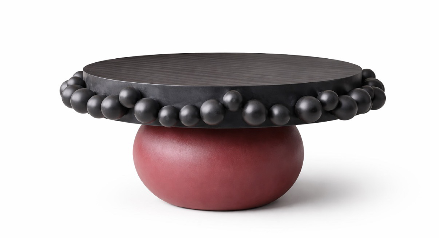 Ce qui frappe d’abord, c’est cette constellation de sphères sculptées directement dans l’épaisseur du plateau en bois. Un jeu de rythme, d’ombre et de profondeur qui rappelle autant l’architecture que l’orfèvrerie. Le résultat est saisissant : un objet qui semble en apesanteur malgré sa masse évidente, porté par une base aux courbes douces.