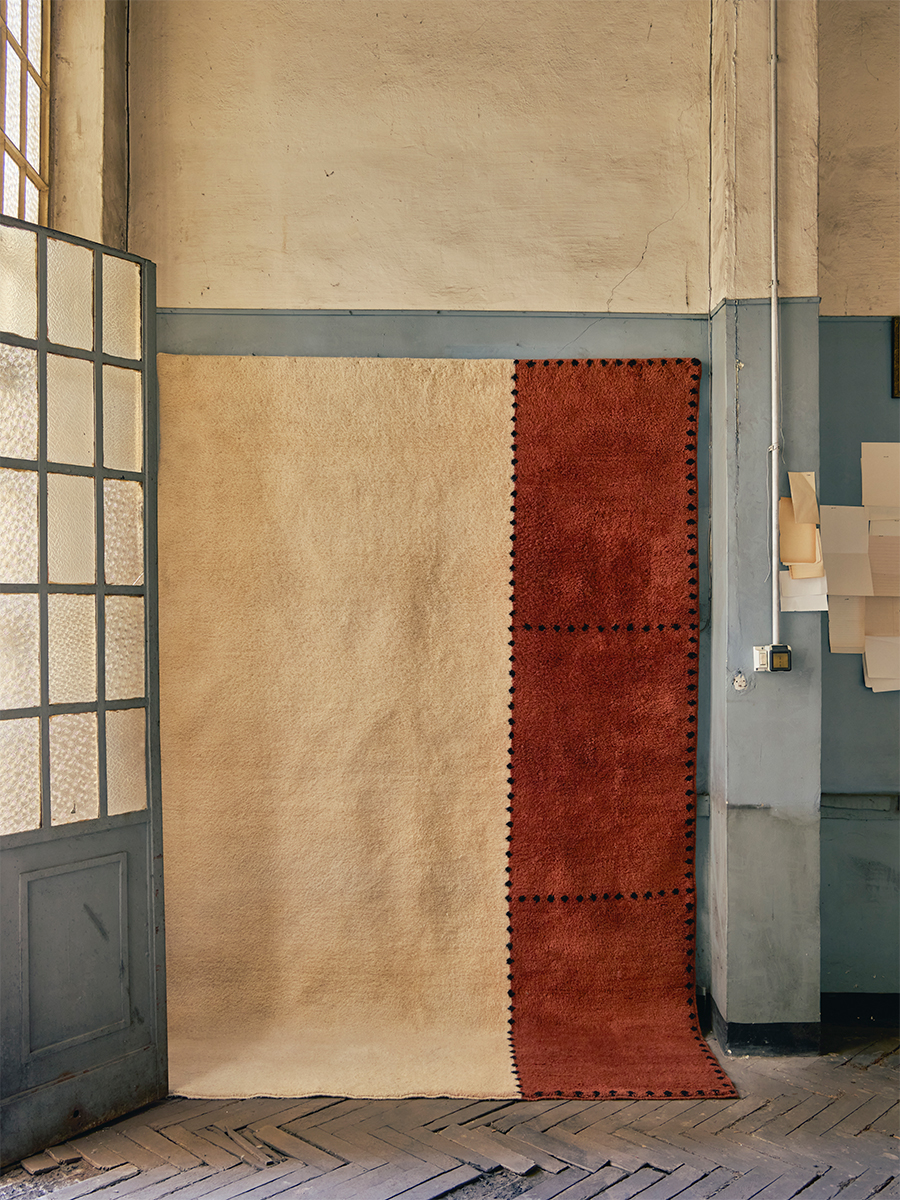 Les tapis proviennent de l’atelier Beni Rugs situé à l’extérieur de Marrakech, où la marque a établi une structure de production intégrée. La laine utilisée est issue de moutons des montagnes de l’Atlas, tandis que les papiers de l’installation provenaient d’archives de vieilles usines portugaises et espagnoles des années 1960-70.