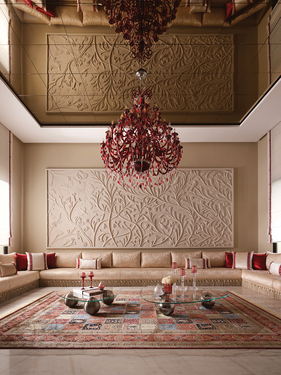 Le salon marocain dévoile son mur sculpté en relief, œuvre de menuisiers traditionnels de Casablanca, sublimé par un chandelier et des appliques Iris Cristal.