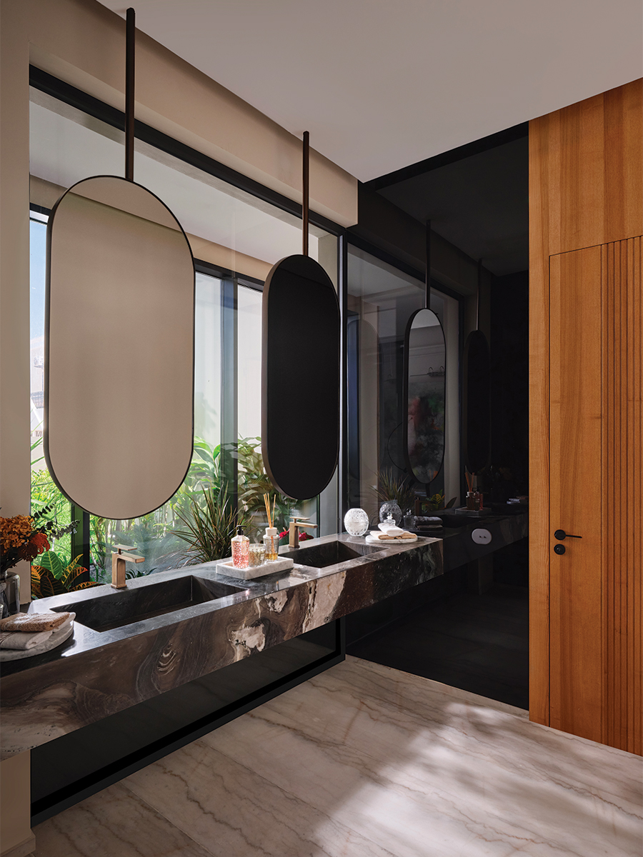 Les salles de bain marient le marbre Sahara Marbre aux boiseries chaleureuses dans un jeu de contrastes maîtrisé.