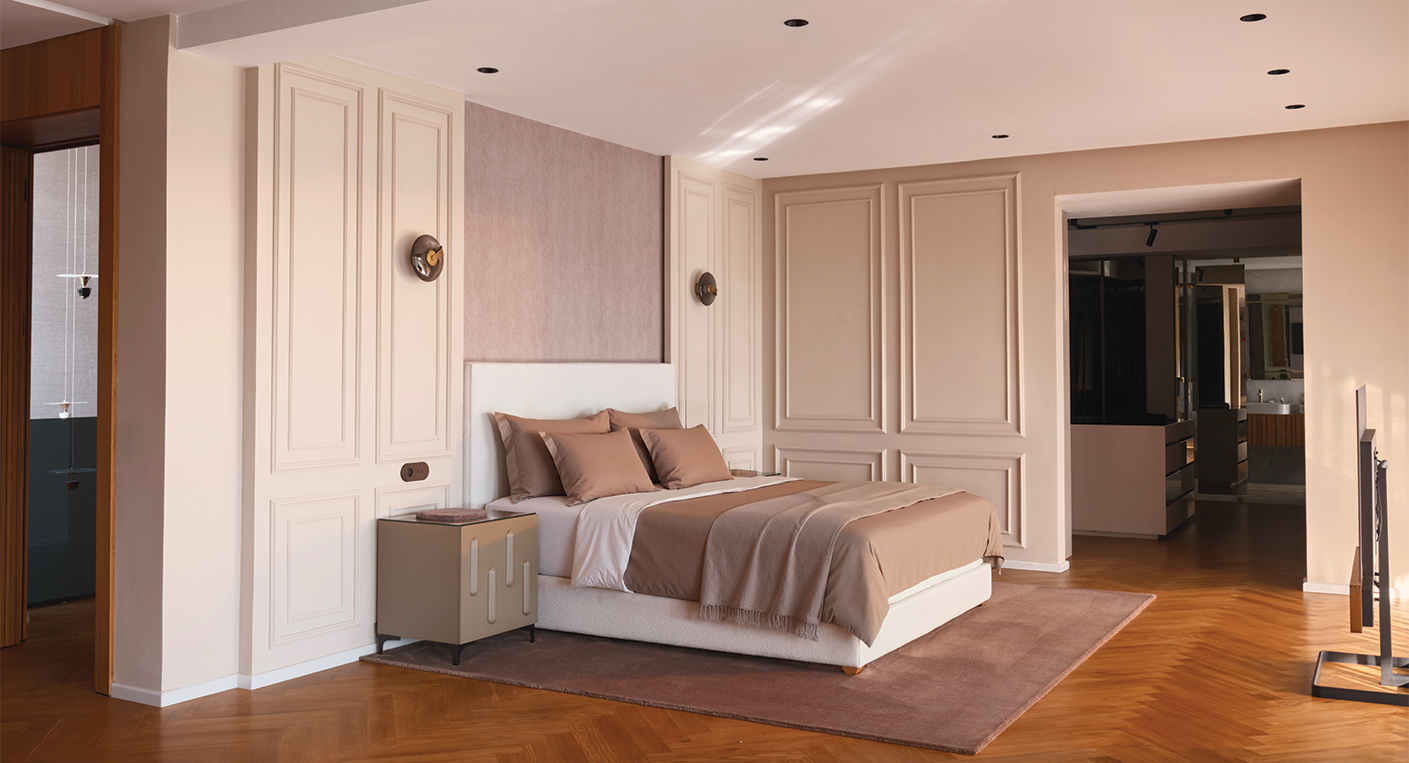 La suite parentale de 100 m² privilégie la sobriété avec ses tons poudrés et son aménagement sur mesure.