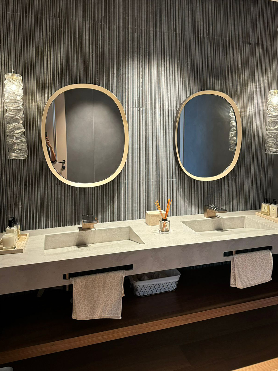 Surprise : son espace préféré est la salle de bain. « J’adore transformer un petit espace en quelque chose de magnifique« , avoue-t-elle. Dans ces espaces restreints où chaque centimètre compte, elle crée de véritables havres de paix en jouant avec les textures, les couleurs et l’éclairage.