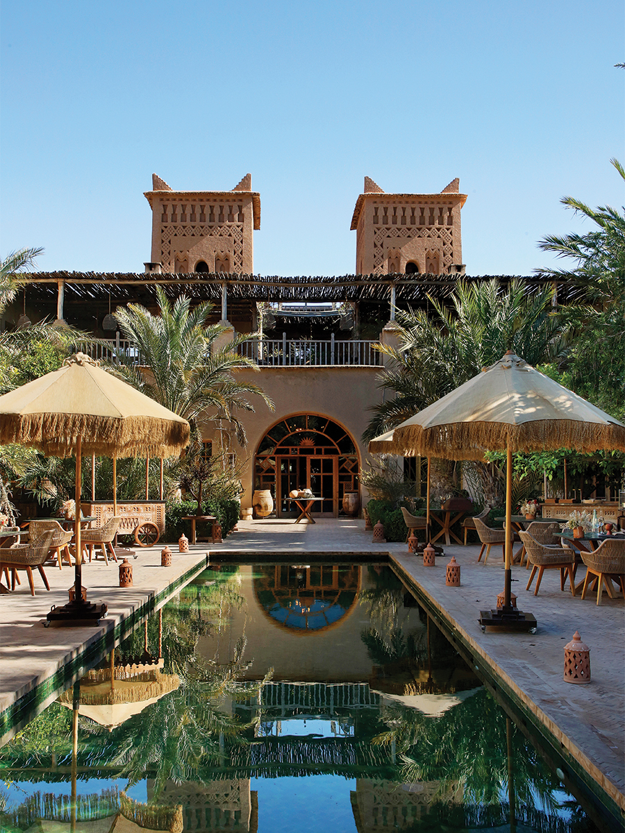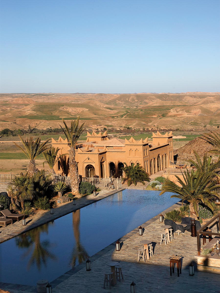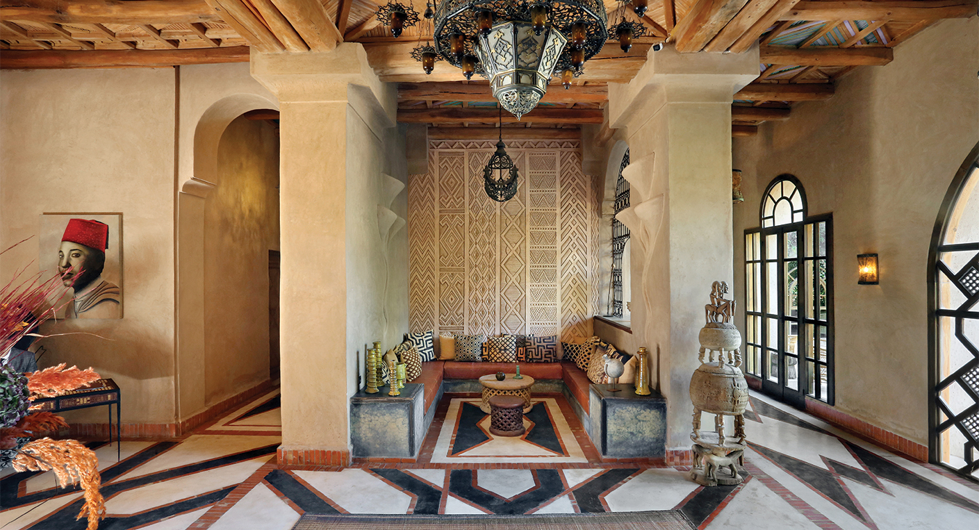 Roche sculptée, tadelakt, tataoui et objets chinés sur la route des kasbahs : dès le lobby, le ton est donné.