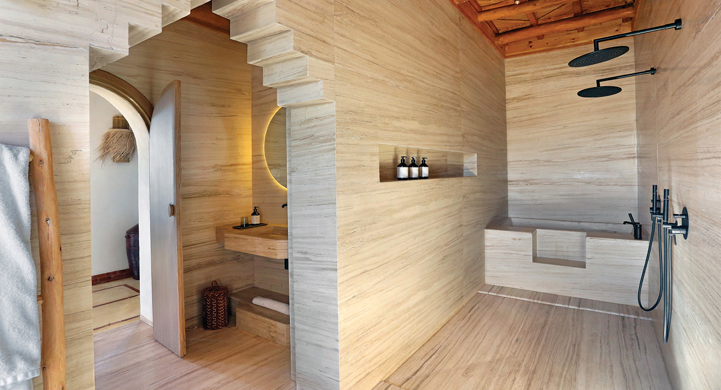 Un mois de travail par salle de bain pour chacune des 37 chambres a été nécessaire pour obtenir ce rendu de marbre qui file de mur en mur.