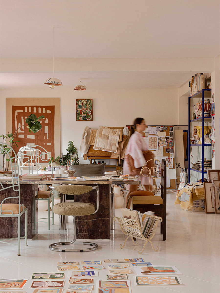 Laurence Leenaert a 25 ans lorsqu’elle s’installe dans la médina de Marrakech. Jeune diplômée des Beaux-Arts en Belgique, elle s’inspire des artisans pour développer un langage graphique fait de motifs géométriquement imparfaits, de doodles amazighs, dans une palette terracotta-sable-bleu majorelle paradoxalement libre de tout cliché. Céramiques, tapis, textiles… les supports se multiplient, la signature reste immédiatement reconnaissable.