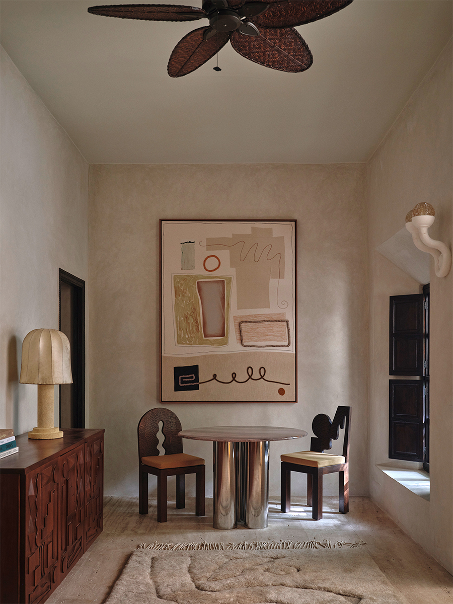 « J’ai dû penser toute l’expérience de bout en bout pour créer un monde authentiquement moderne et marrakchi », explique Laurence. Et pour que l’expérience se prolonge au-delà du séjour, presque tout ce qui se trouve dans le riad est proposé à la vente.