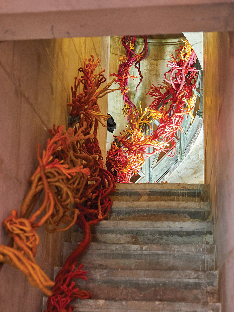 À la Colonne de Juillet, en plein coeur de la Place de la Bastille, monument habituellement fermé au public, Aude Franjou a glissé ses Coraux de la Liberté. L’installation textile monumentale aux couleurs chaudes grimpe le long des murs et évoque les fonds marins menacés. Une première visite en exclusivité dans un lieu patrimonial peu accessible.