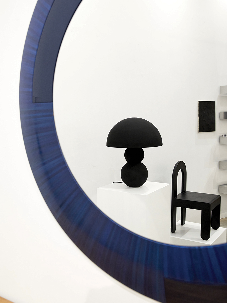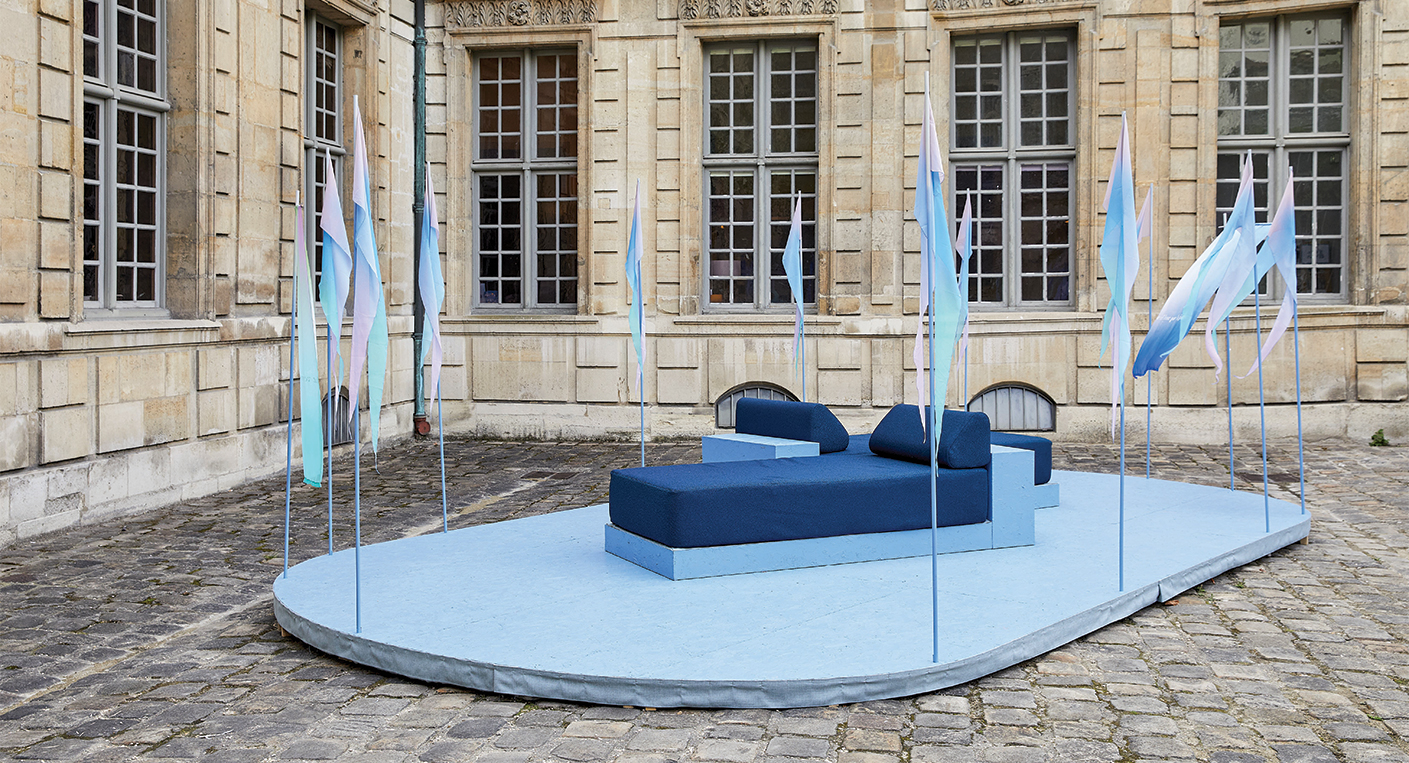 Dans la cour de l’Hôtel de Sully, Ymer&Malta présentait son mobilier en bois sculpté au cœur de l’Orangerie. À l’extérieur, Lucas Huillet et Alexandre Helwani proposaient une installation olfactive questionnant le thème de la Folie, habillée de textiles bleus qui contrastaient avec la pierre du XVIIe siècle.