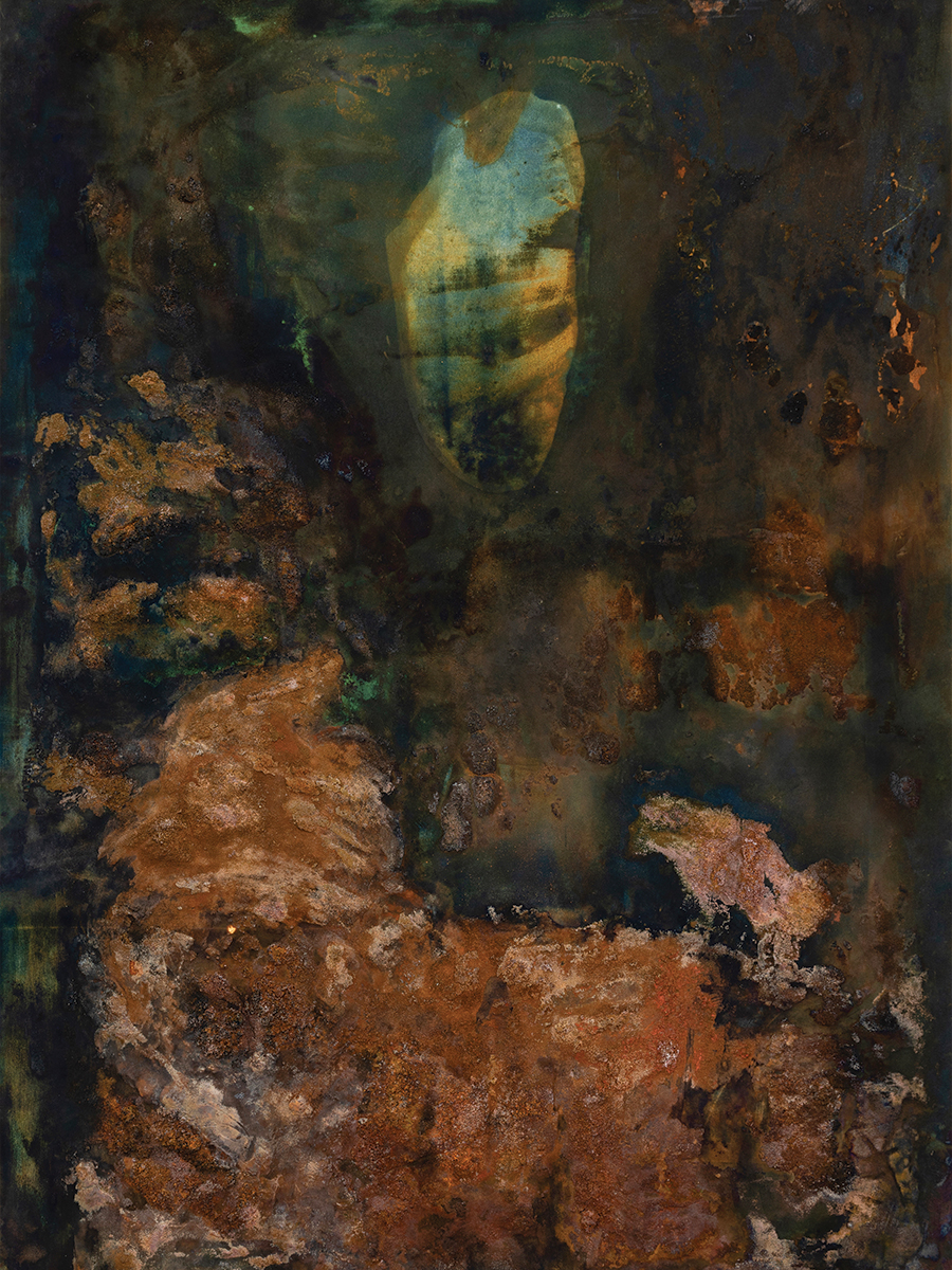 Il révèle des réminiscences inattendues, scelle l’insaisissable : les visions hypnagogiques du réveil, des fragments oniriques que l’argentique seul ne suffit pas à fixer. « Je recherche l’accidentel pour essayer de le maîtriser », résume-t-elle. Car c’est là que tout commence pour Hasnae El Ouarga. Dans cette limite du medium photographique face à l’image mentale, dans cette nécessité d’adjoindre la matière, le temps et le hasard pour approcher sa vision. La matière, c’est le cuivre et le laiton ajoutés, le temps, celui de l’oxydation. Une manière de questionner le temps de la création et celui qui passe, et de sonder ce qu’elle nomme « les surfaces multiples de l’image construite ».