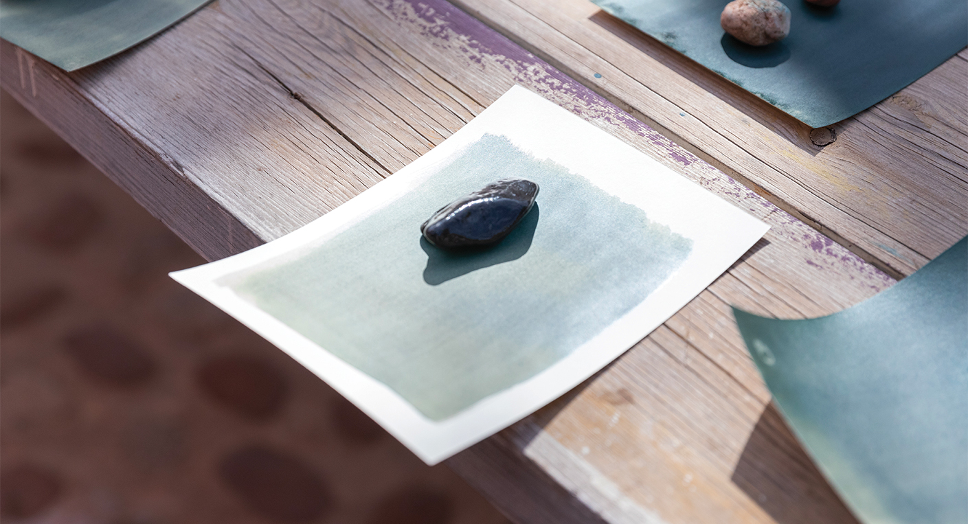 Les pierres sont là, toujours. Quand elle ne les porte pas comme des talismans, Hasnae El Ouarga les convoque dans l’intimité de son atelier au Jardin Rouge, la résidence d’artistes de la Fondation Montresso. Diplômée de l’ESAV Marrakech, la jeune photographe explore depuis quelques années le cyanotype, un procédé qui remonte au XIXe siècle. Ce sont des roches, mémoires minérales du temps long, qu’elle dépose sur papier photosensible exposé à la lumière naturelle. La pierre laisse alors une empreinte sur le support, et durant ce processus d’impression, l’artiste orchestre autant qu’elle se retire, car l’accidentel a toute sa place.