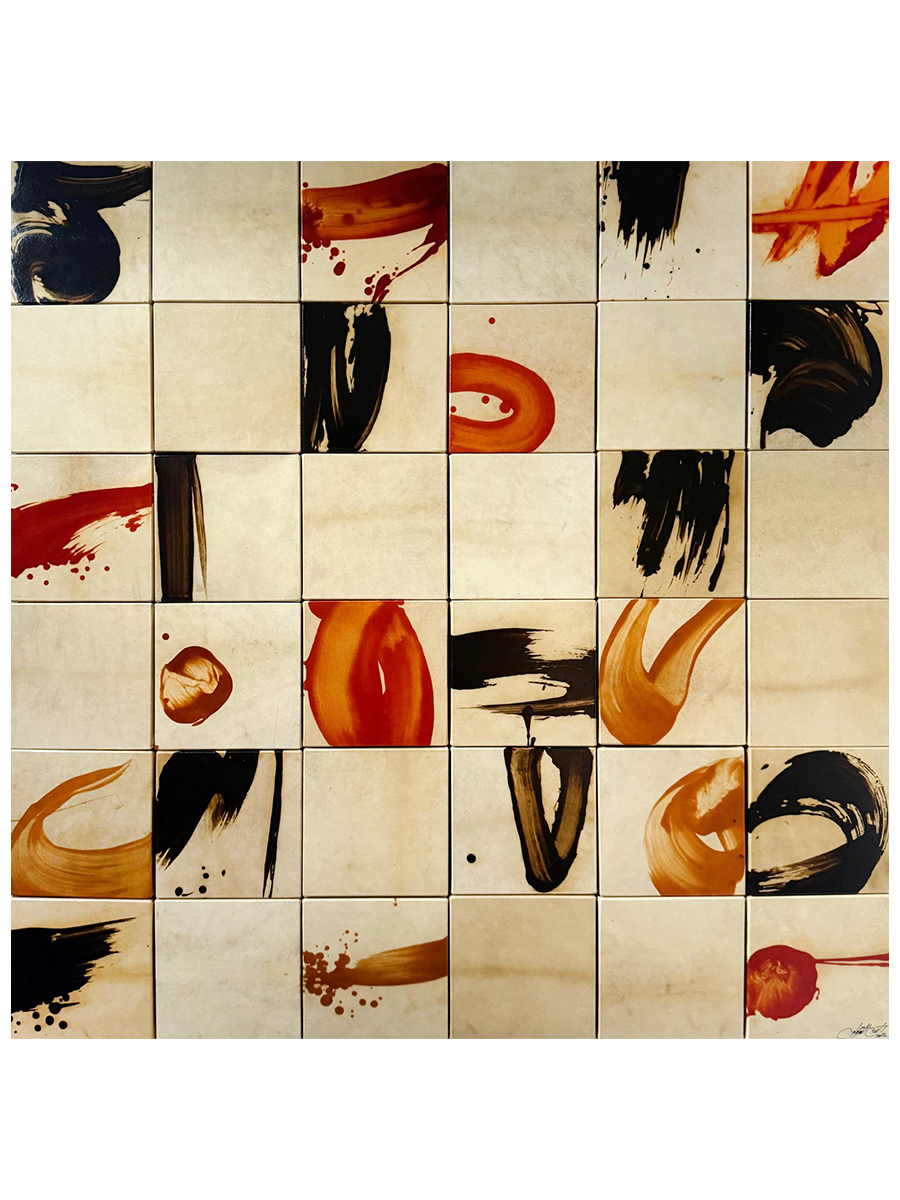 Dispersion, technique mixte sur peau, 122 x 122 cm, 2026.