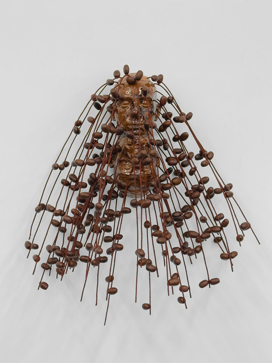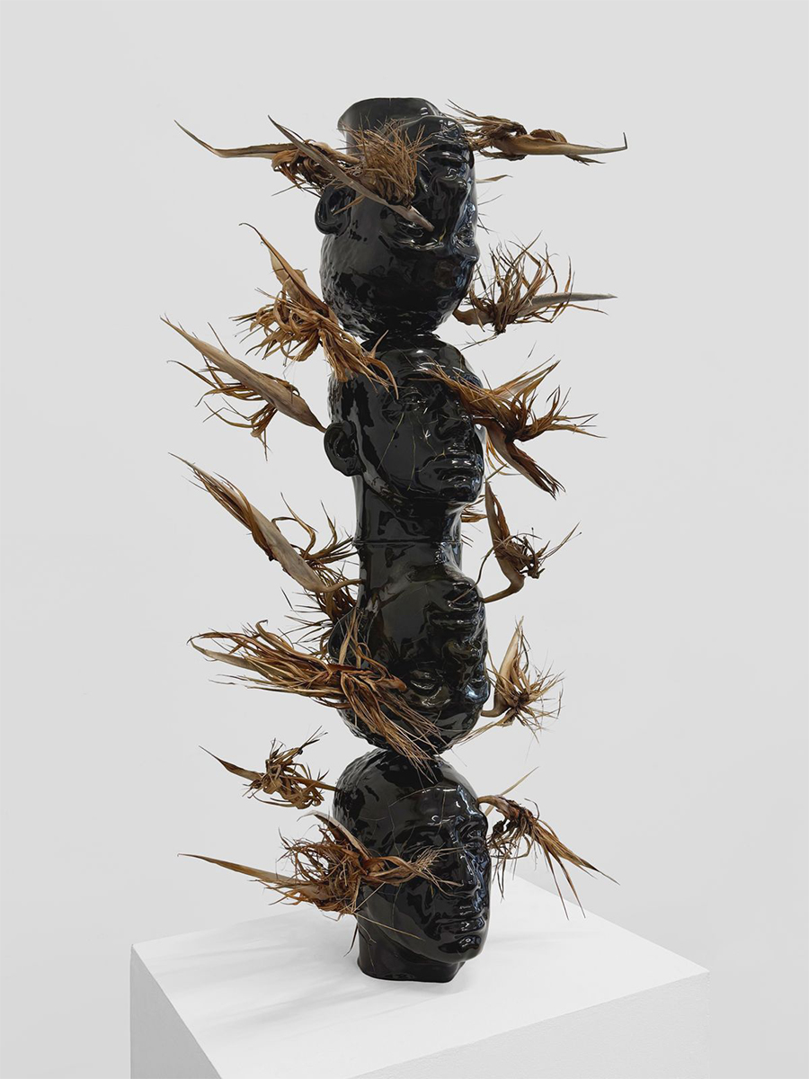 L’artiste tisse des correspondances entre la botanique et le corps humain : le stipe du palmier comme colonne vertébrale, les palmes comme des mains, les dates comme des doigts. Ses sculptures — totems où se mêlent bustes à son effigie et formes végétales — célèbrent cette hybridation. Le buste, qu’il utilise depuis 2012, n’est plus autoportrait mais « canvas », surface de travail où le visage devient chimère, tronc d’arbre, structure accueillant des dates.