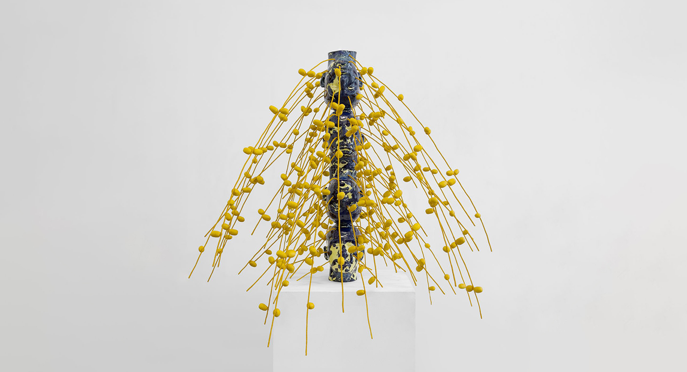 Mehdi-Georges Lahlou Totem au palmier-dattier – De la conférence des palmiers, 2026 Grès (céramique), émaux, laine, peinture acrylique, éléments divers Environ 125 x 90 x 90 cm (+ socle) Pièce unique Courtesy Loft Art Gallery (Casablanca, Marrakech)