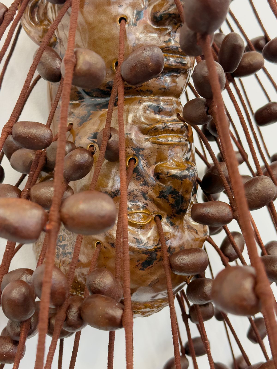 Mehdi-Georges Lahlou De la conférence des palmiers – Palmier-dattier, 2026 Grès (céramique), émaux, laine, encre de Chine rouge, éléments divers Environ 80 x 50 x 50 cm (mural) Pièce unique Courtesy Loft Art Gallery (Casablanca, Marrakech)