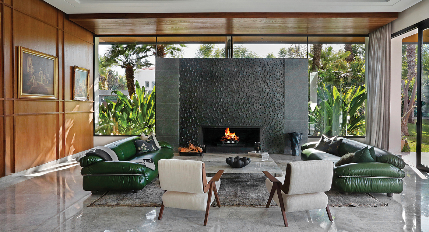 Le papier peint Ananbô déploie ses motifs végétaux, prolongeant visuellement le jardin à l’intérieur. « La nature devait être présente partout, sans jamais devenir décorative », souligne l’architecte. Le salon marocain revisite le genre. Un canapé italien aux courbes généreuses remplace l’assise traditionnelle, tandis que le plafond en chêne s’arrondit aux angles. Les lignes droites s’effacent. Au centre, la cheminée en tôle métallique s’impose comme une pièce sculpturale. « C’est un élément fort, pensé comme un point d’ancrage au cœur de la maison », précise Yasmina Benabdellah. À l’étage, trois chambres spacieuses, chacune dotée de son dressing et de sa salle de bain, prolongent cette écriture chaleureuse. Le bois circule d’une pièce à l’autre : paravents, plafonds, portes coulissantes et moulures assurent une continuité visuelle et matérielle.