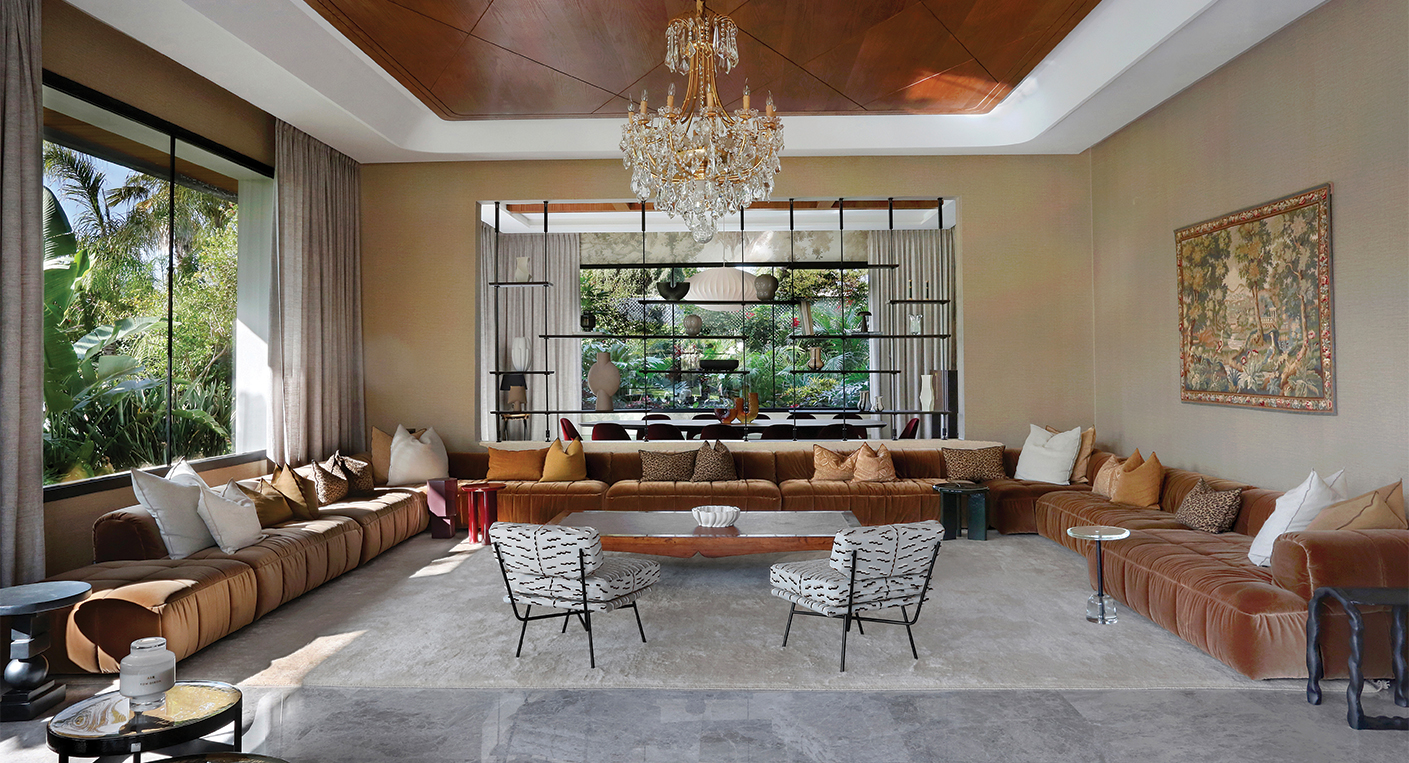 Dans le salon, le canapé Five to Nine de Tacchini s’inscrit près du jardin, sous un plafond en chêne à motifs géométriques. Tous les éléments de décoration et le mobilier viennent du showroom Clay Concept store.