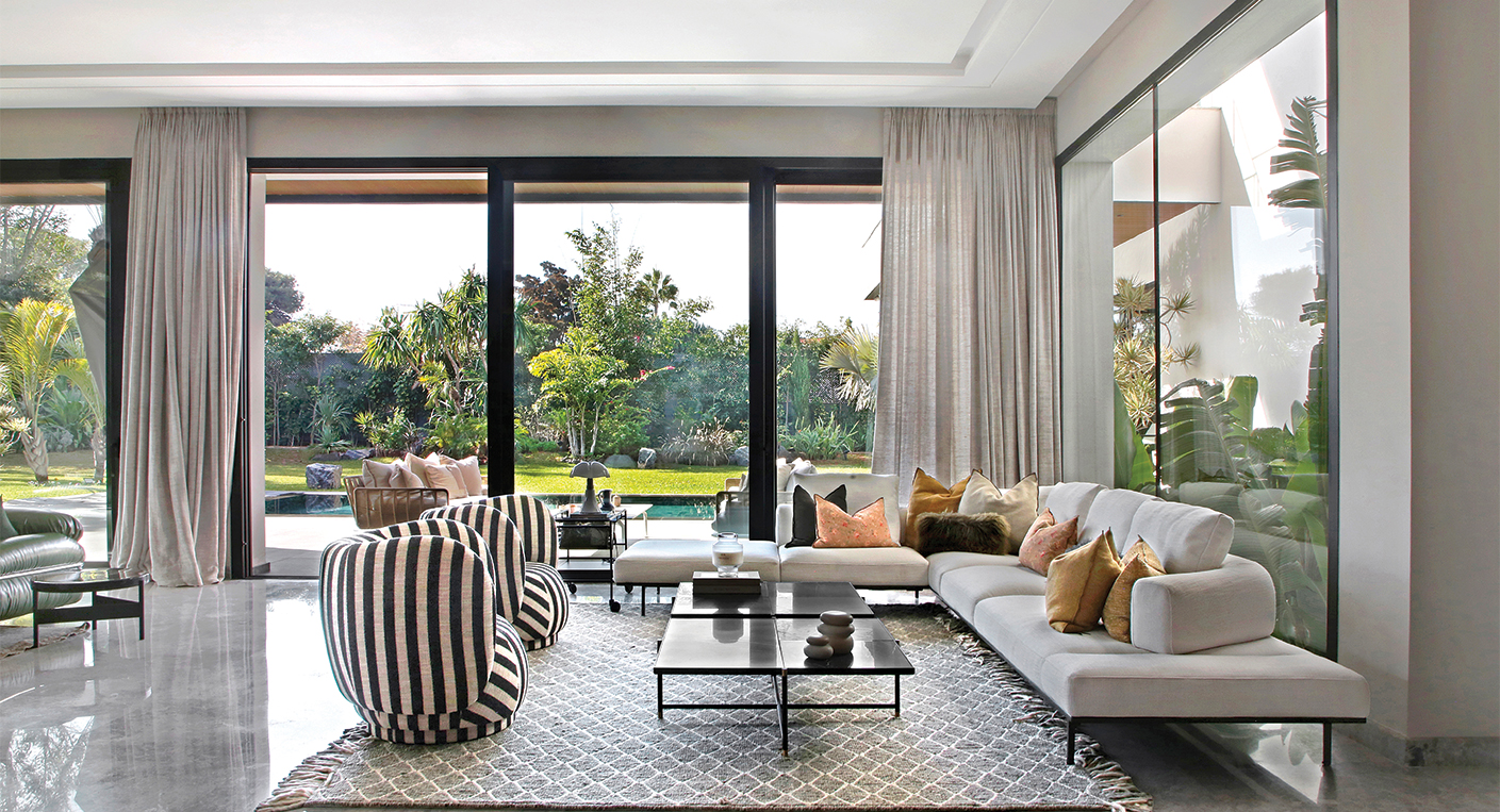 « La circulation devait rester fluide, avec un lien permanent entre les espaces et le jardin », poursuit Yasmina Benabdellah. Entre la salle à manger et le salon marocain revisité, une bibliothèque ouverte organise la transition.