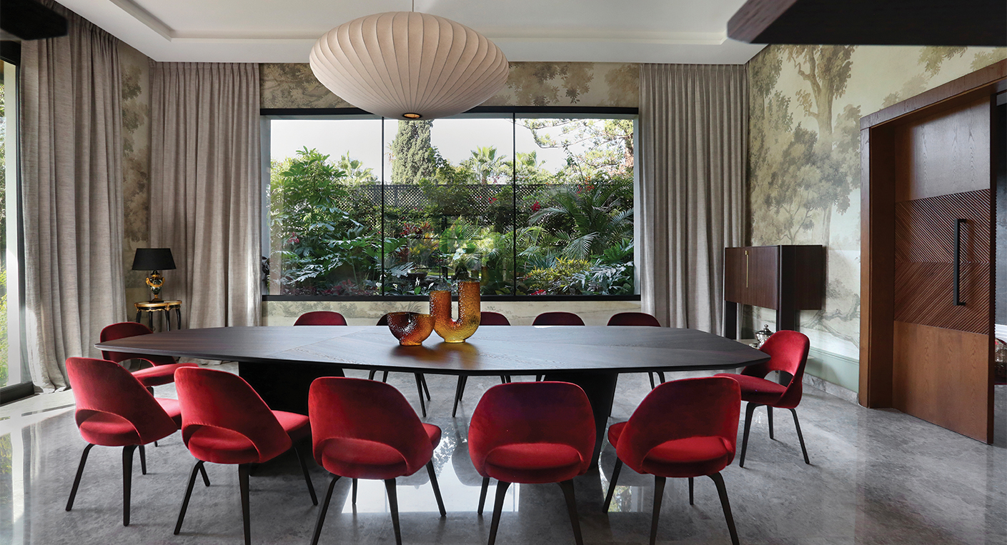 Dans la salle à manger, la table Senator de Cattelan Italia est entourée de chaises Knoll, surplombée d’une suspension Nelson Bubble de HAY, face à une verrière cadrant la végétation extérieure.