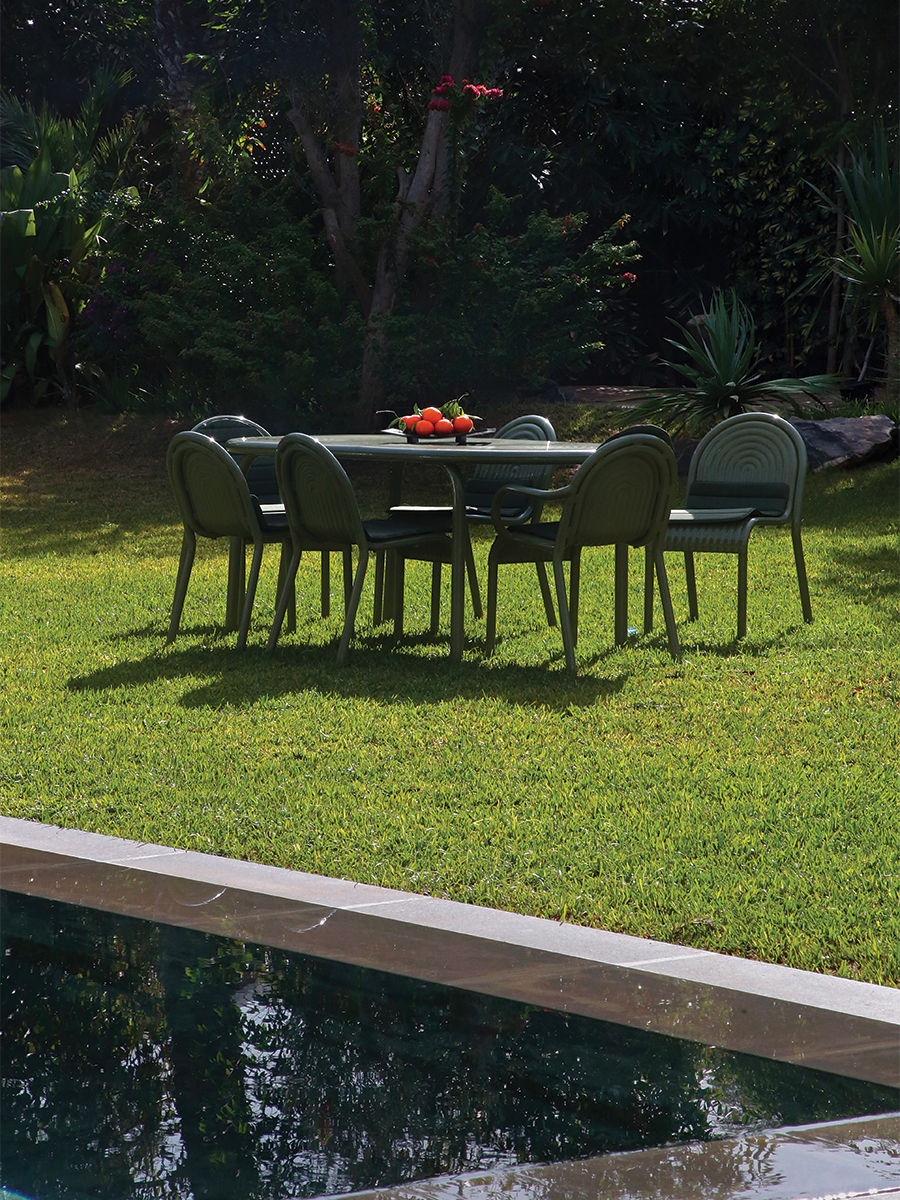 Dans le jardin, la table et les assises de la collection Groove de Tom Dixon prennent place sur la pelouse.