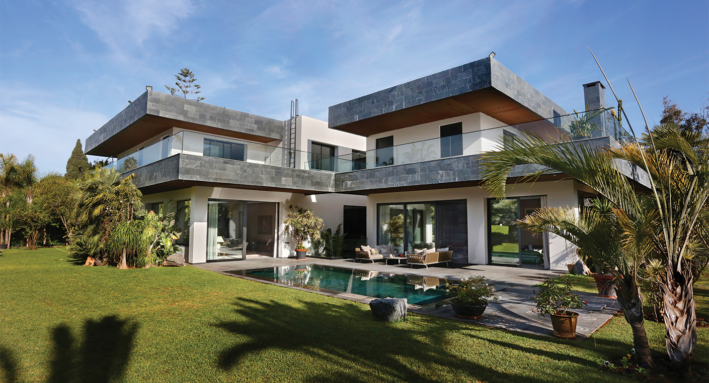 Tout part d’un équilibre. Celui d’un projet résolument contemporain, adouci par la présence du bois, omniprésent sans jamais devenir décoratif. « L’enjeu était d’éviter toute froideur, tout en assumant une écriture très contemporaine », explique l’architecte. En façade, l’ardoise dialogue avec des faux plafonds en composite effet bois. Les larges porte-à-faux protègent naturellement les terrasses du soleil casablancais. À l’intérieur, le regard file de l’entrée à la cheminée, glisse vers les baies vitrées et s’échappe jusqu’à la piscine. Nulle cloison franche.