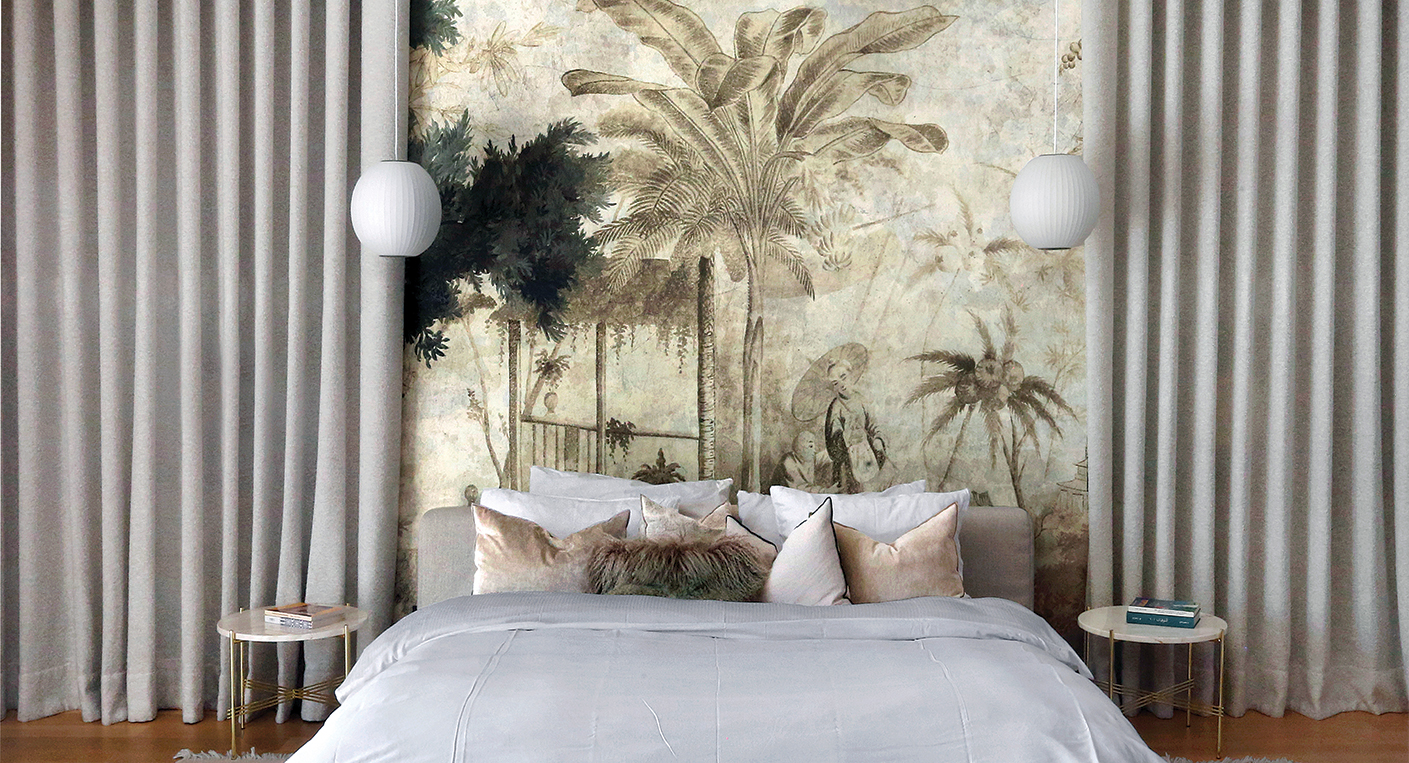 Dans la chambre, le papier peint Ananbô déroule son paysage tropical. Ci-contre.