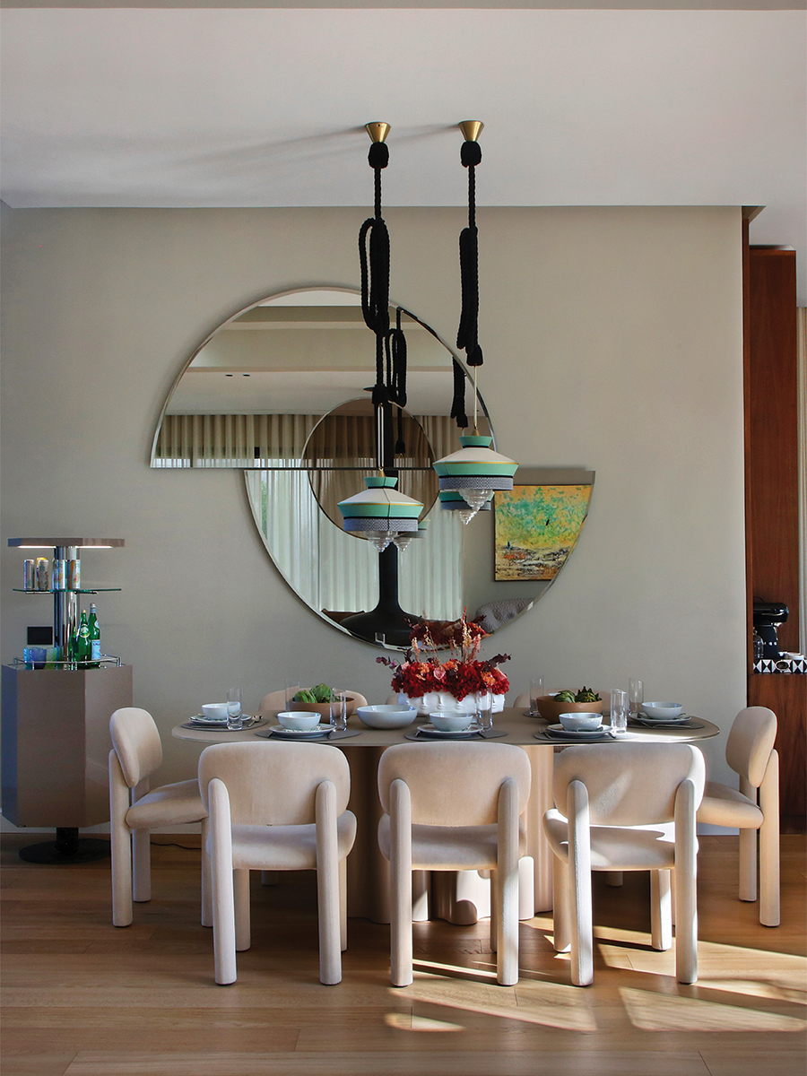 Dans la salle à manger, les chaises Driade entourent une table Saba, surplombées de suspensions Contardi. Bar Lift signé Sacha Lakic pour Roche Bobois.