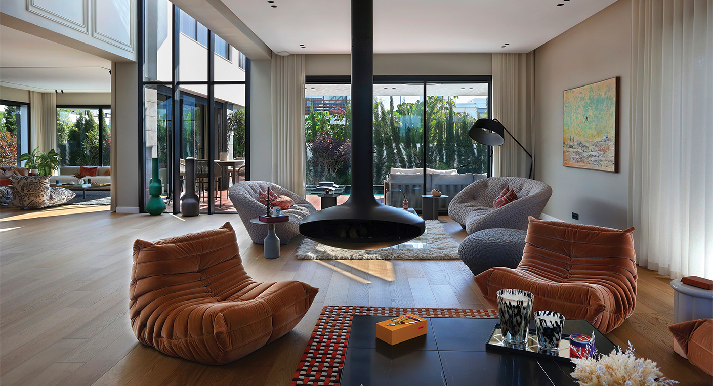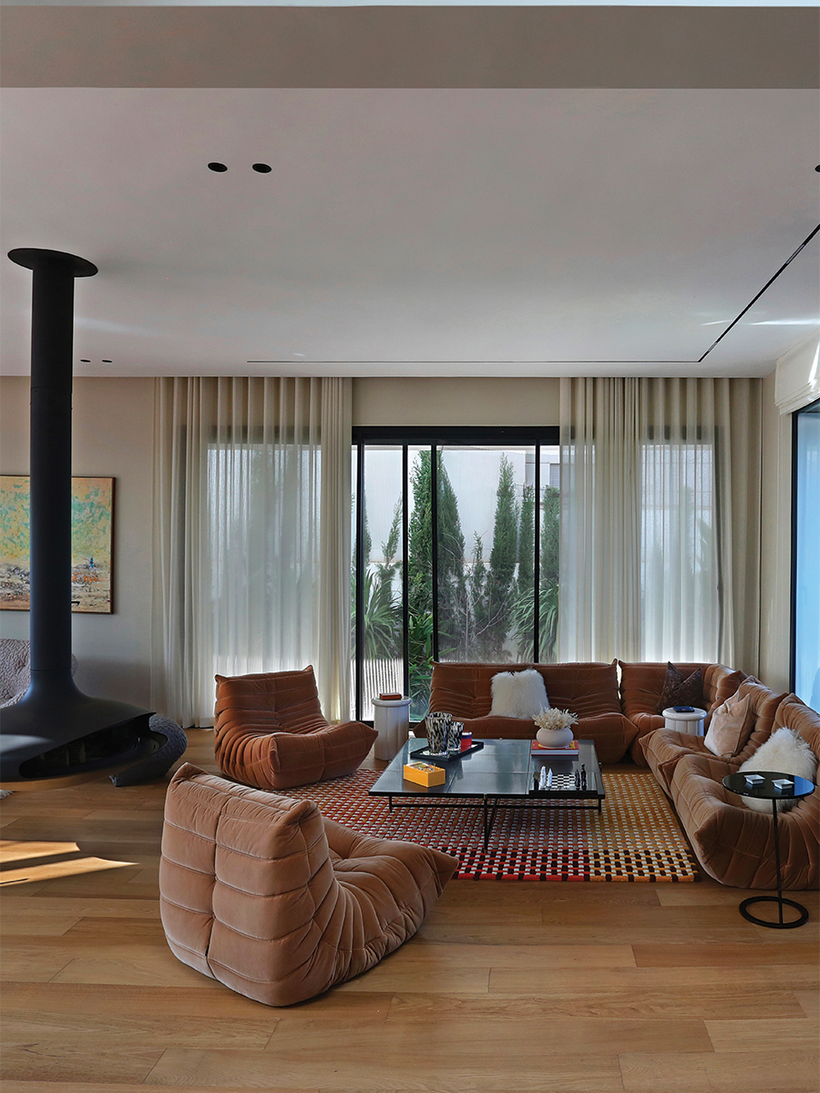 Le contraste constitue le fil conducteur du projet. Matières claires et surfaces sombres se répondent, créant une lecture dynamique des espaces sans jamais les alourdir. Cette approche traverse les espaces de réception, pensés comme des variations autour d’une même écriture. Au cœur de la maison, la cheminée suspendue et rotative, importée de France, devient un point de convergence. Visible depuis plusieurs espaces, elle structure les volumes et accompagne les moments de réception.