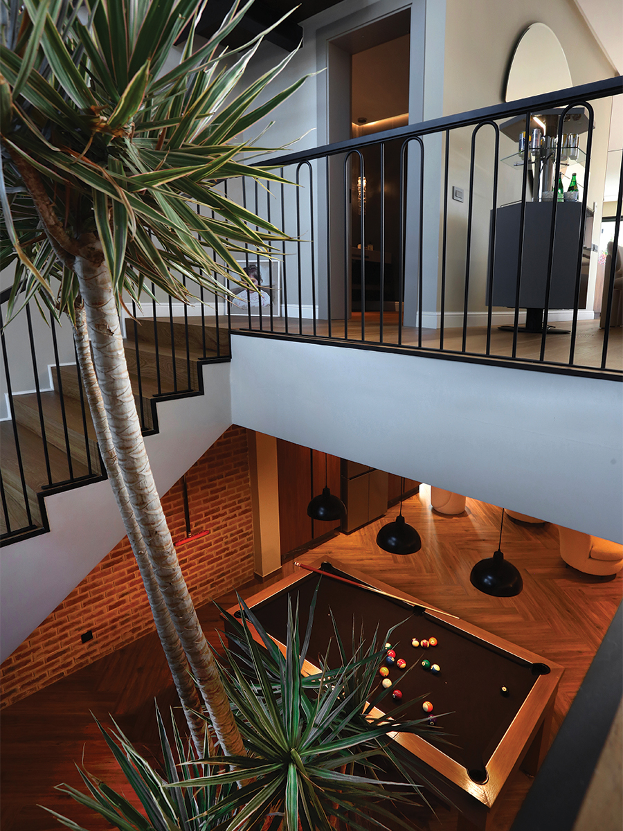La cage d’escalier dessert les différents niveaux de la maison. En contrebas, la salle de jeux dévoile son billard et son mur en briques, dans une atmosphère résolument industrielle.