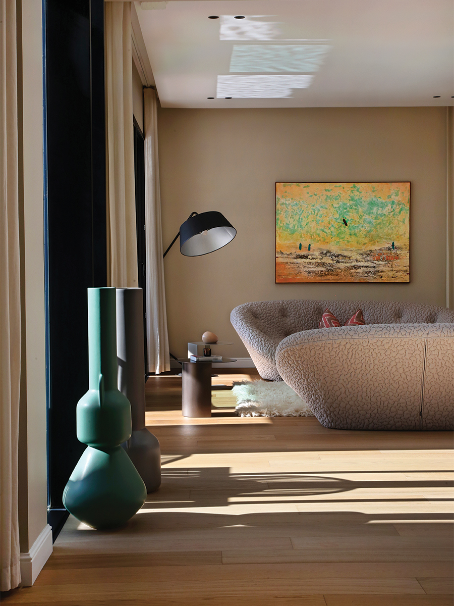 Autour de la cheminée, deux salons se font face : l’un structuré par les Togo de Michel Ducaroy, l’autre par les assises Ploum dessinées par Ronan & Erwan Bouroullec pour Ligne Roset (voir photo à droite).