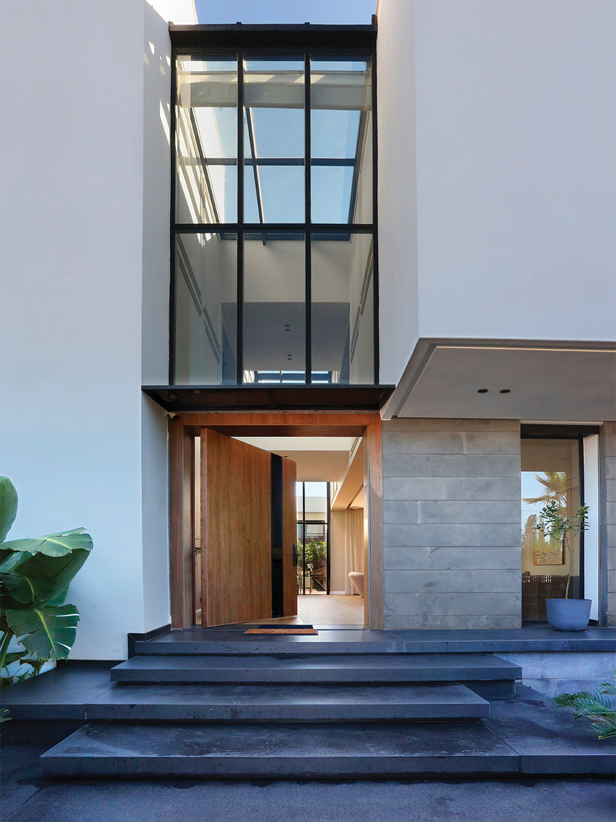 La porte d’entrée en bois, réalisée sur mesure par des artisans marocains, s’inscrit sous un puits de lumière de huit mètres. Une invitation à pénétrer dans cette maison familiale baignée de lumière.