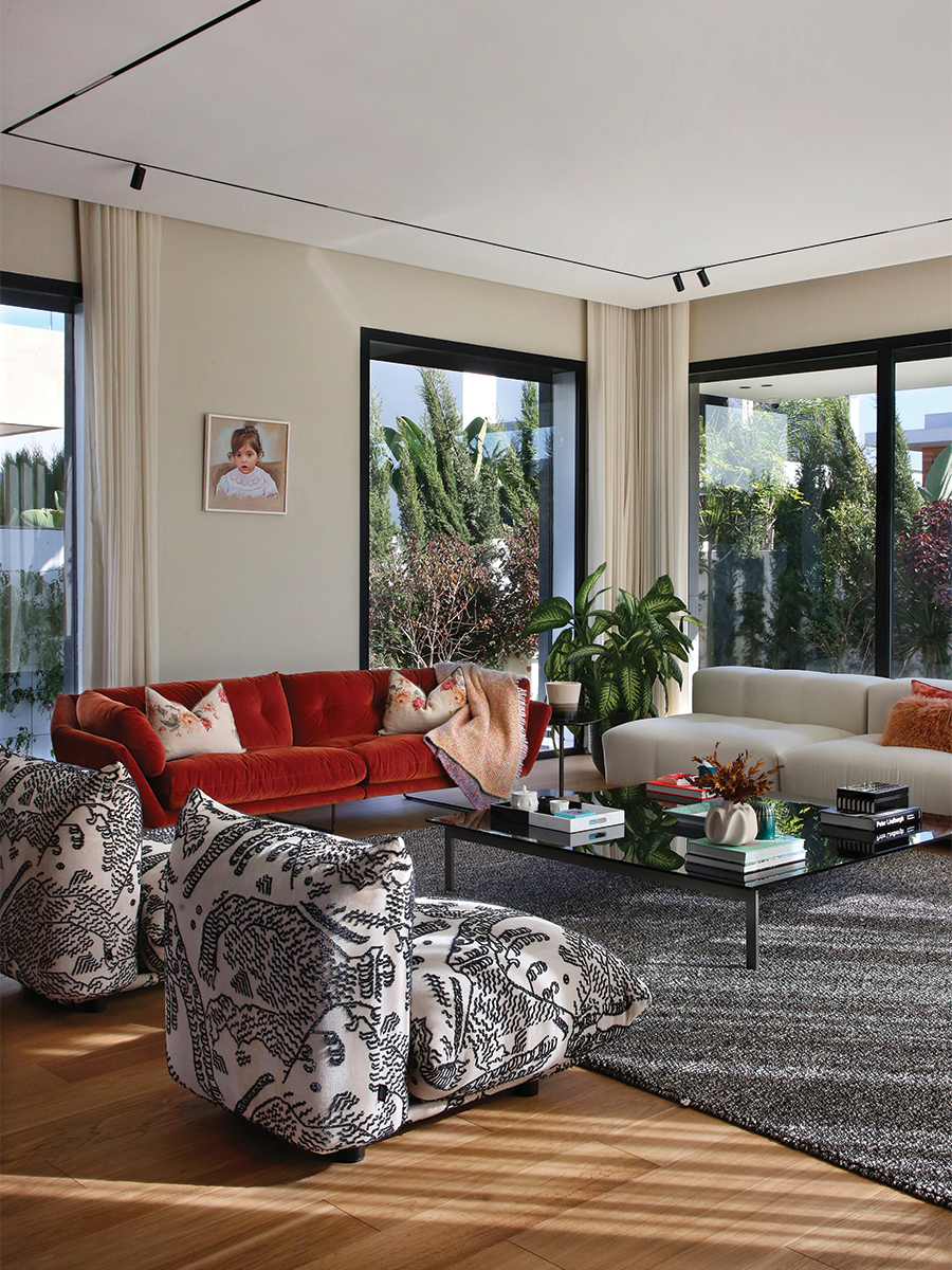 Dans le coin lecture, face à la bibliothèque, le canapé Pixel de Saba s’accorde au tapis noir et blanc de PIEDS NUS, accompagné d’une table basse Arflex. Les coussins Maison de Vacances apportent une touche terracotta.
