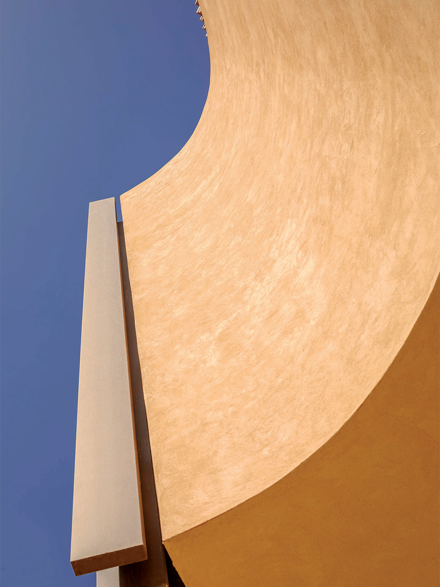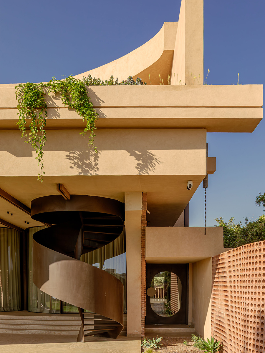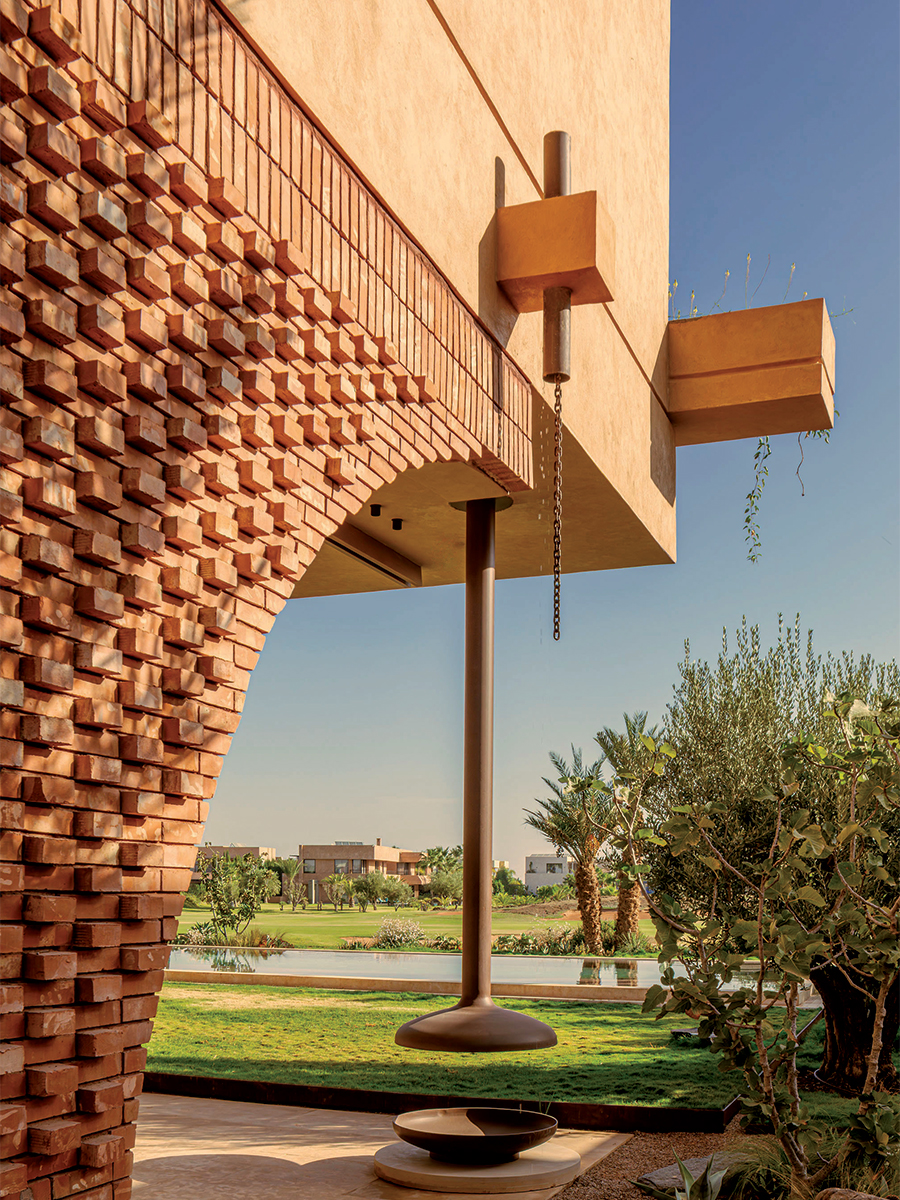 L’architecture respire en deux temps. Au sol, un socle massif, ancré par sa briquette de Safi aux tons rougeâtres, presque charnels. À l’étage, un volume courbe qui flotte, libéré de la terre. Côté rue, la façade se protège derrière des stries qui filtrent la lumière rasante de l’ouest. Côté golf, elle s’ouvre largement à travers de grandes baies aux vitrages galbés. « On a travaillé avec des matériaux locaux », résume l’architecte. Il a dessiné lui-même les poignées en pierre de Taza, le calepinage des briquettes, les portes pivotantes. Chaque détail compte.