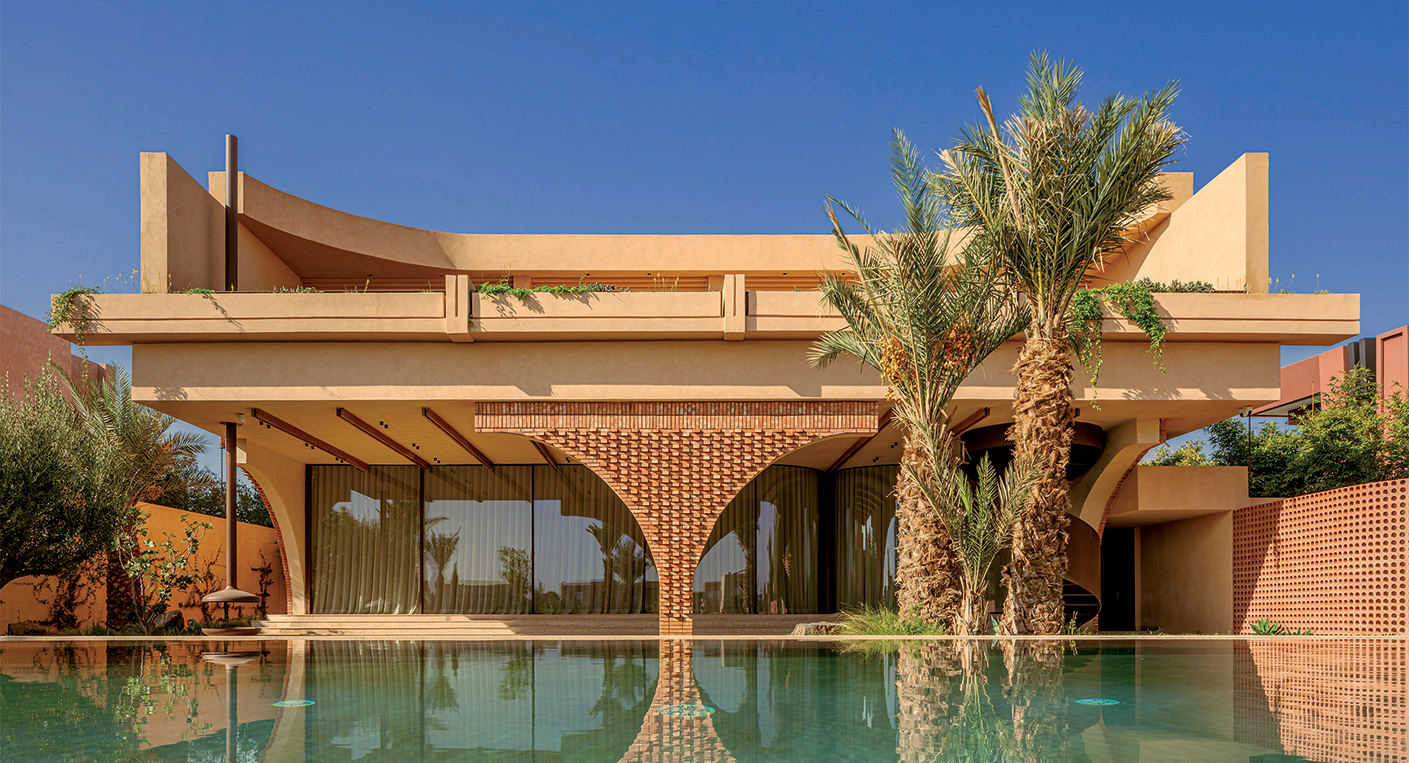 Façade sud : la briquette de Safi ancre la maison, tandis que les volumes courbes de l’étage semblent flotter. La piscine hors sol prolonge cette écriture organique.