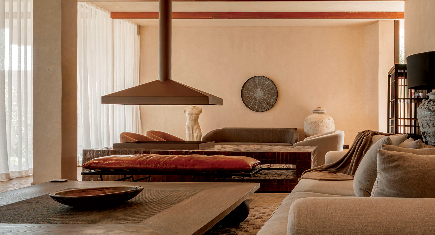 Elle a conçu sur-mesure les chaises, les sculptures, la tête de lit ronde d’inspiration wabi-sabi. « Je voulais que l’on se sente dépaysé. » Le paysagisme, confié à l’Atelier KLP, privilégie graminées, oliviers et cactées.