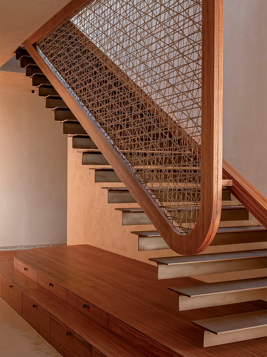 Dès l’entrée, l’escalier intérieur saisit le regard : marches scellées au mur, garde-corps suspendu dans le vide. À l’étage, un espace de méditation s’ouvre uniquement sur le ciel, par une percée zénithale. Ni fenêtre, ni horizon. Juste la lumière qui tombe. « C’est un espace de recul, un boudoir », confie l’architecte. La salle à manger, isolée par des portes tendues d’I-Mesh — cette membrane en fibre naturelle commercialisée par Inspiration Design By — s’ouvre sur les salons à travers une baie galbée.