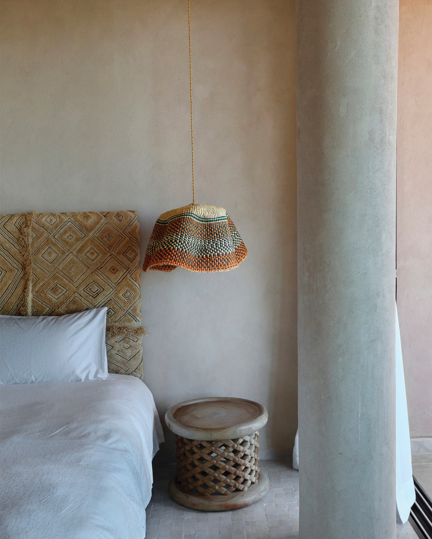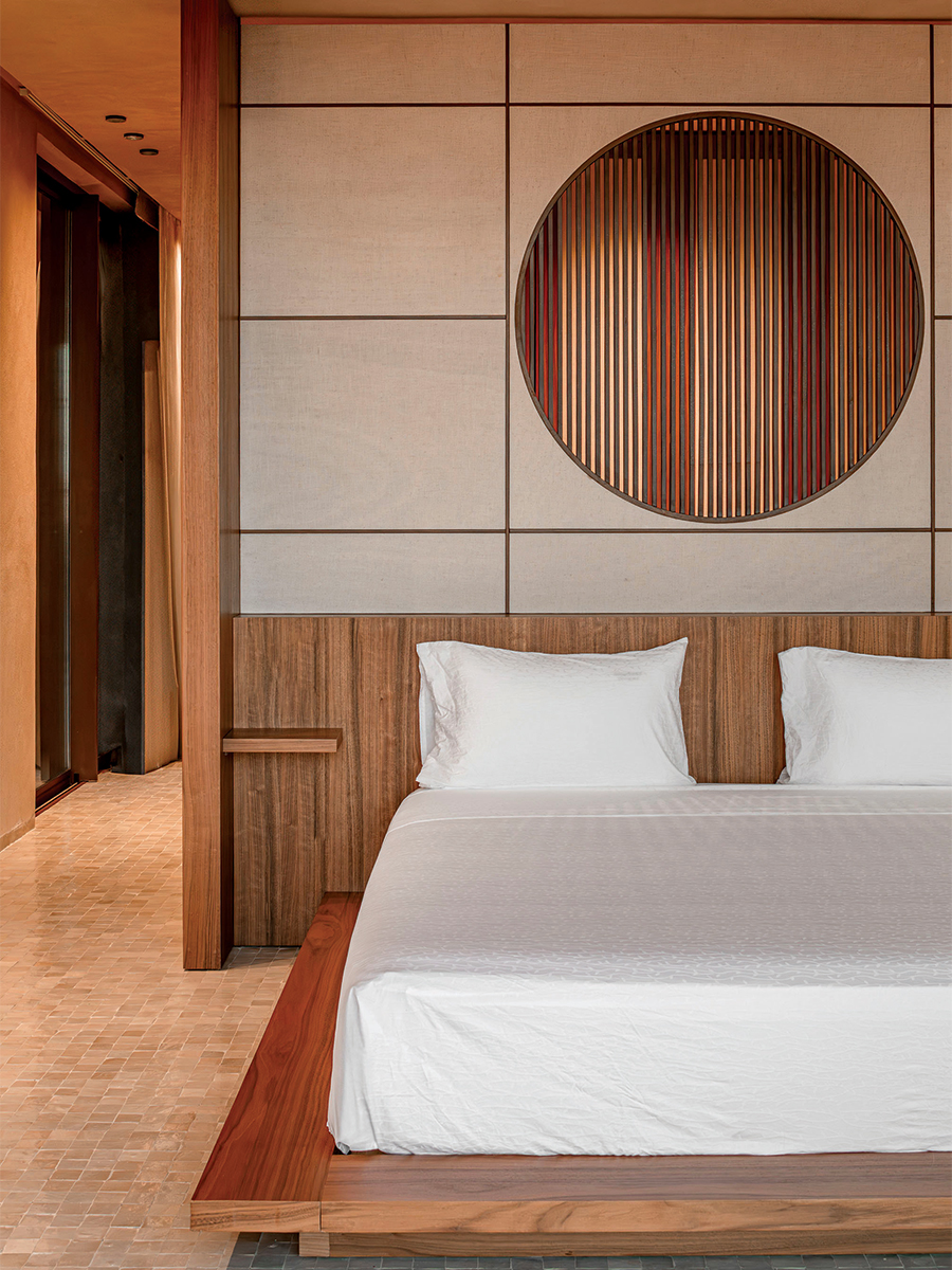 Dans la suite parentale, une tête de lit ronde d’inspiration wabi-sabi s’inscrit dans une palette de tadelakt et de boiseries.