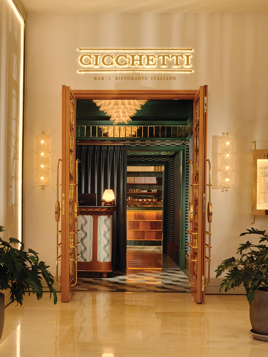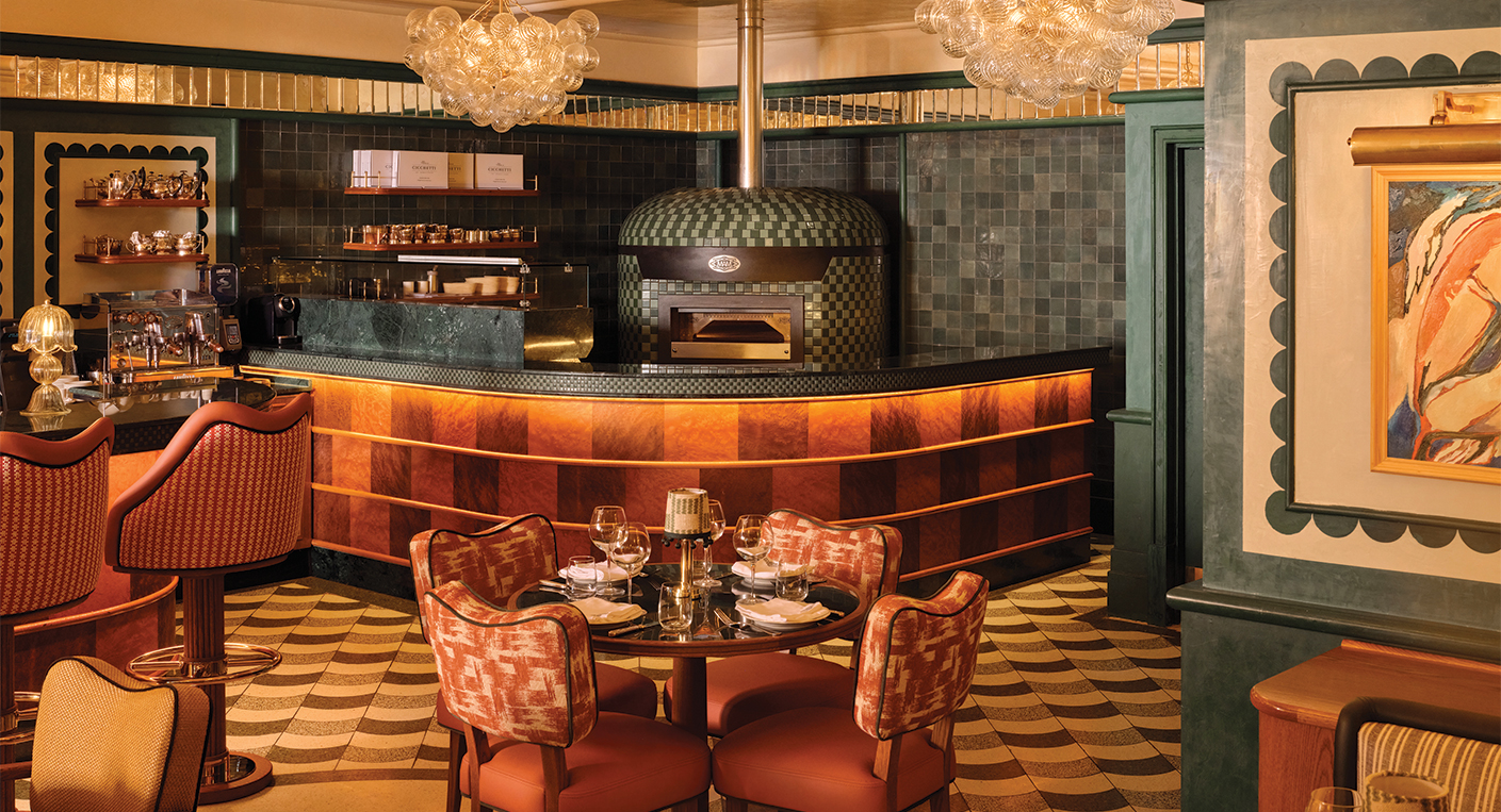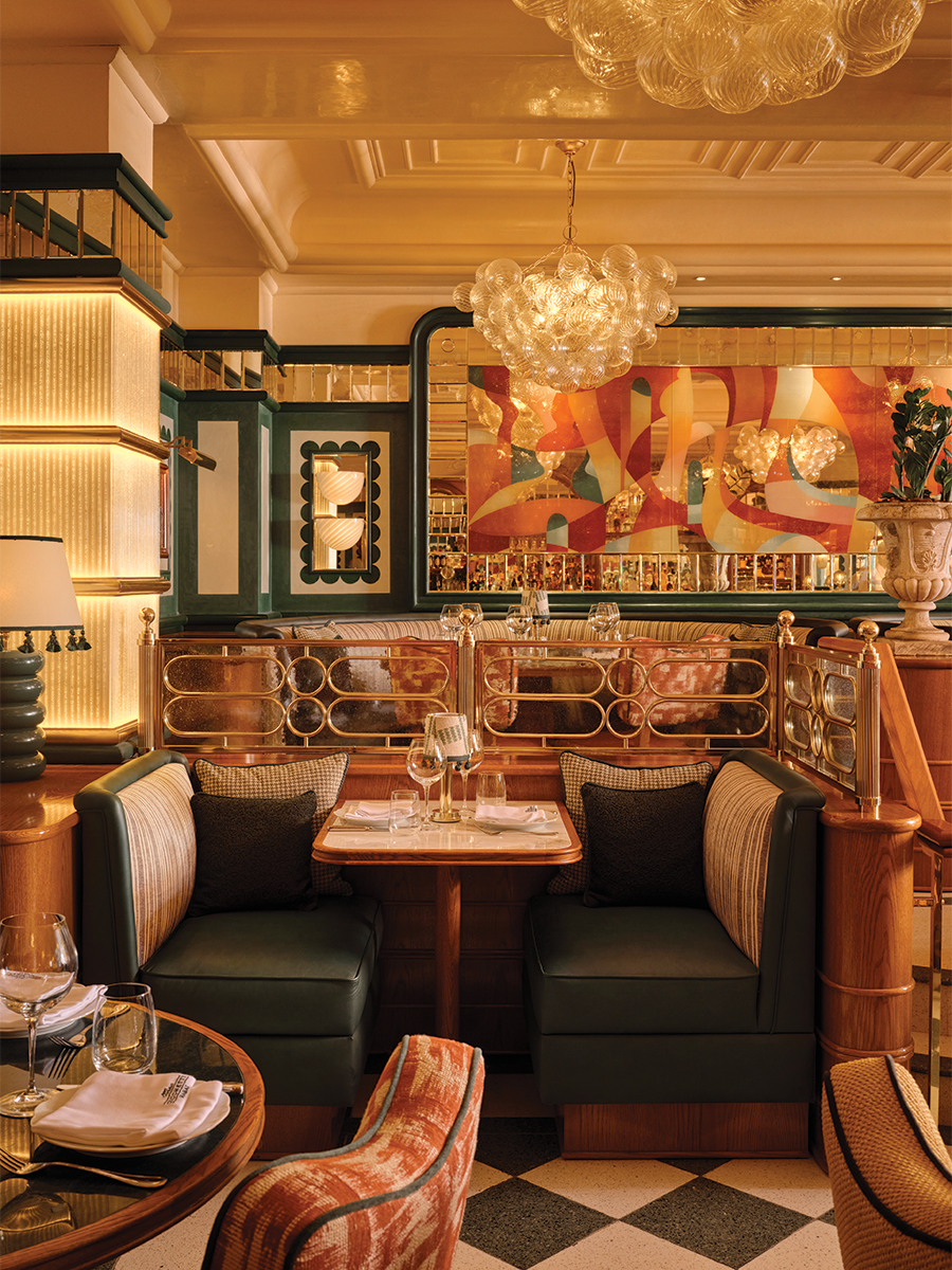 Chaque zone offre une intensité particulière, et le sol en terrazzo graphique assure la continuité. Mais c’est la lumière qui orchestre véritablement le lieu. Naturellement lumineux en journée, le restaurant offre un spectacle encore plus saisissant de nuit, lorsque les suspensions en grappes de verre et lustres de Murano diffusent une chaleur dorée qui se réfracte sur les surfaces vernies et les miroirs anciens. Le plafond à caissons, subtilement travaillé, amplifie ces jeux de reflets.