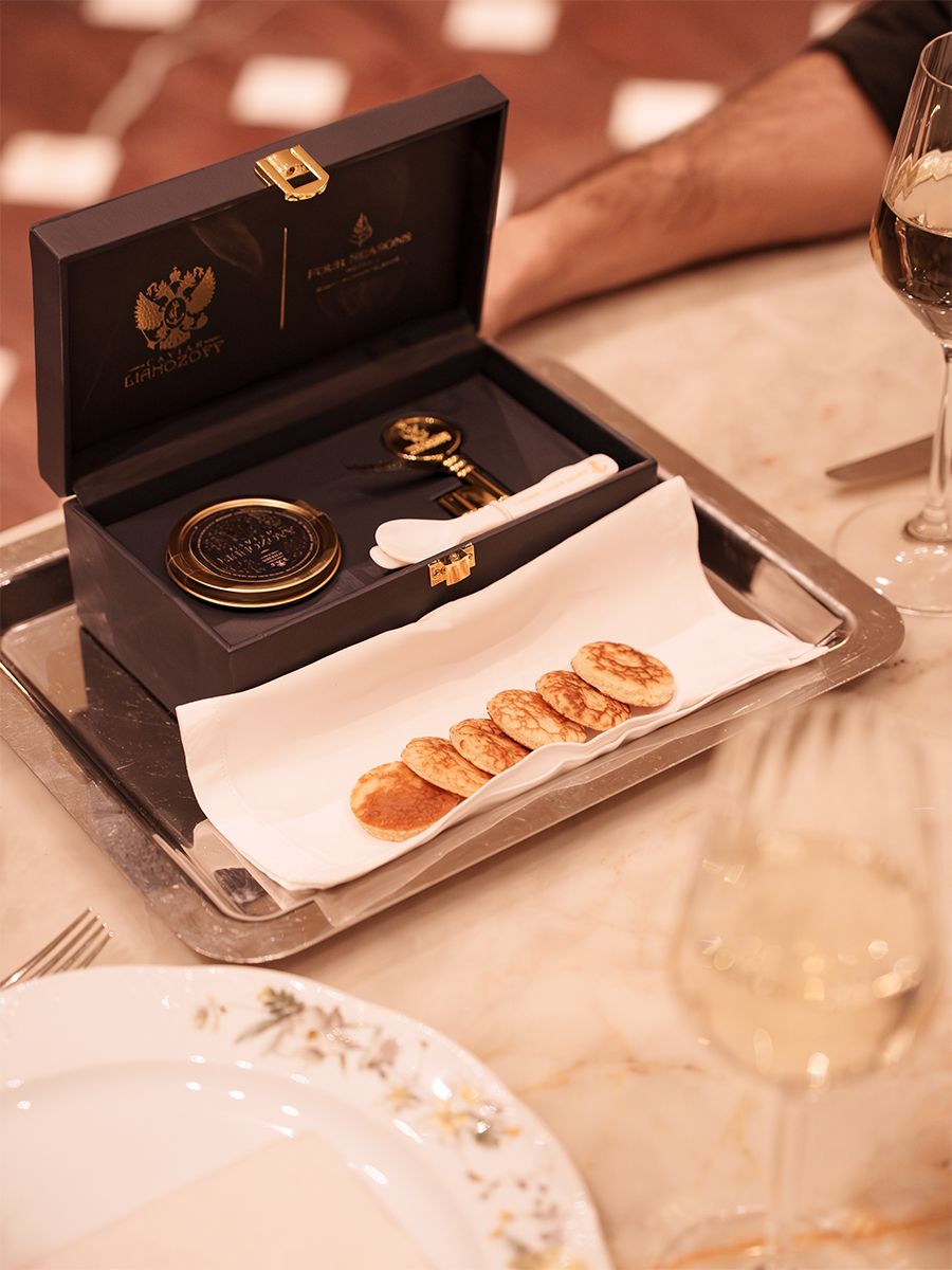 La suite promet l’extraordinaire avec une « Surprise Caviar Box » présentant 30 grammes de caviar sibérien accompagnés de blinis au sarrasin. Suivent une délicate tarte de chair de crabe et un sandwich audacieux de foie gras aux cèpes et truffe noire. Trois créations qui affichent d’emblée l’ambition culinaire de cette soirée.