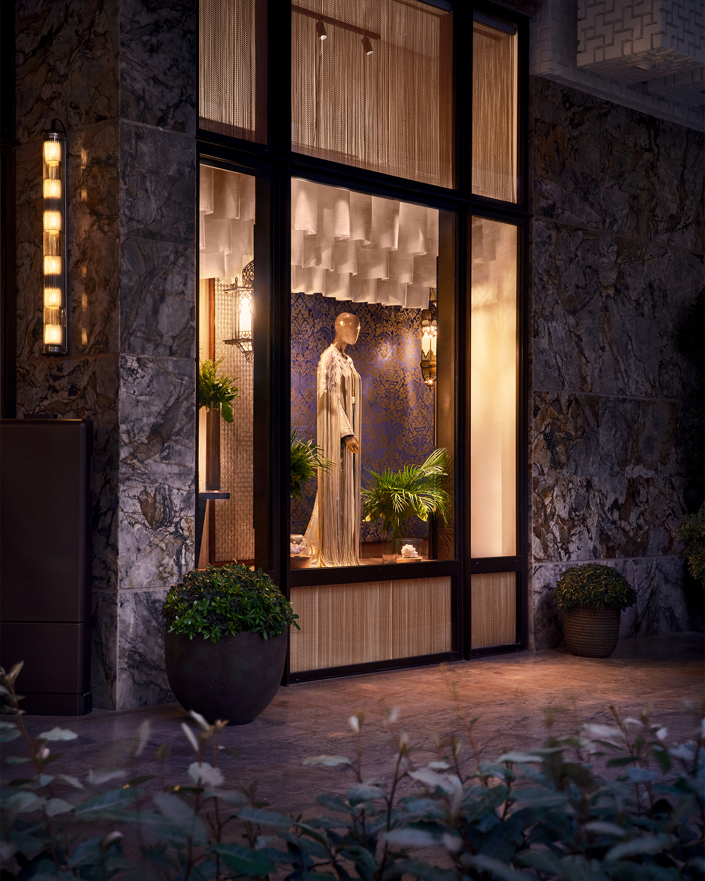 Pour la première édition le 25 avril, le choix s’est porté sur deux noms qui incarnent, chacun à sa manière, l’excellence du savoir-faire marocain contemporain. Albert Oiknine, designer casablancais reconnu pour sa haute couture brodée de perles et de pierres, a investi le Patio avec une sélection de créations. À ses côtés, Blue Jasmine, la maison fondée par Yasmine Benabdellah, gemmologue certifiée du GIA de New York, a pu présenter une collection pensée spécialement pour le Royal Mansour, puisant dans l’héritage Art Déco de Casablanca des années 1930.