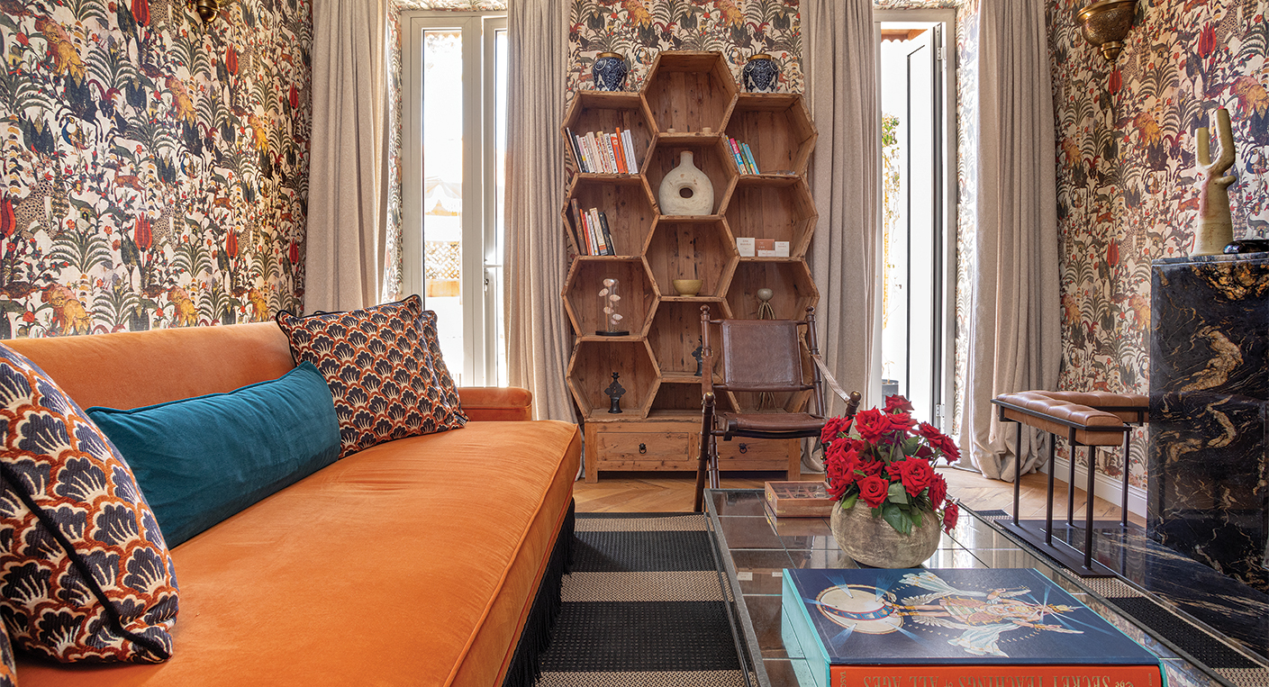L’espace salon tranche avec la sobriété générale. Le papier peint « Arabian Nights » aux motifs orientaux évoque un safari. « Tout le reste est si calme, je voulais créer un contraste, quelque chose de plus audacieux », explique-t-elle. Cette personnalité s’exprime aussi dans les créations artisanales : bougies aux huiles essentielles parfumées aux roses des Oudayas, produits de beauté inspirés des traditions marocaines.