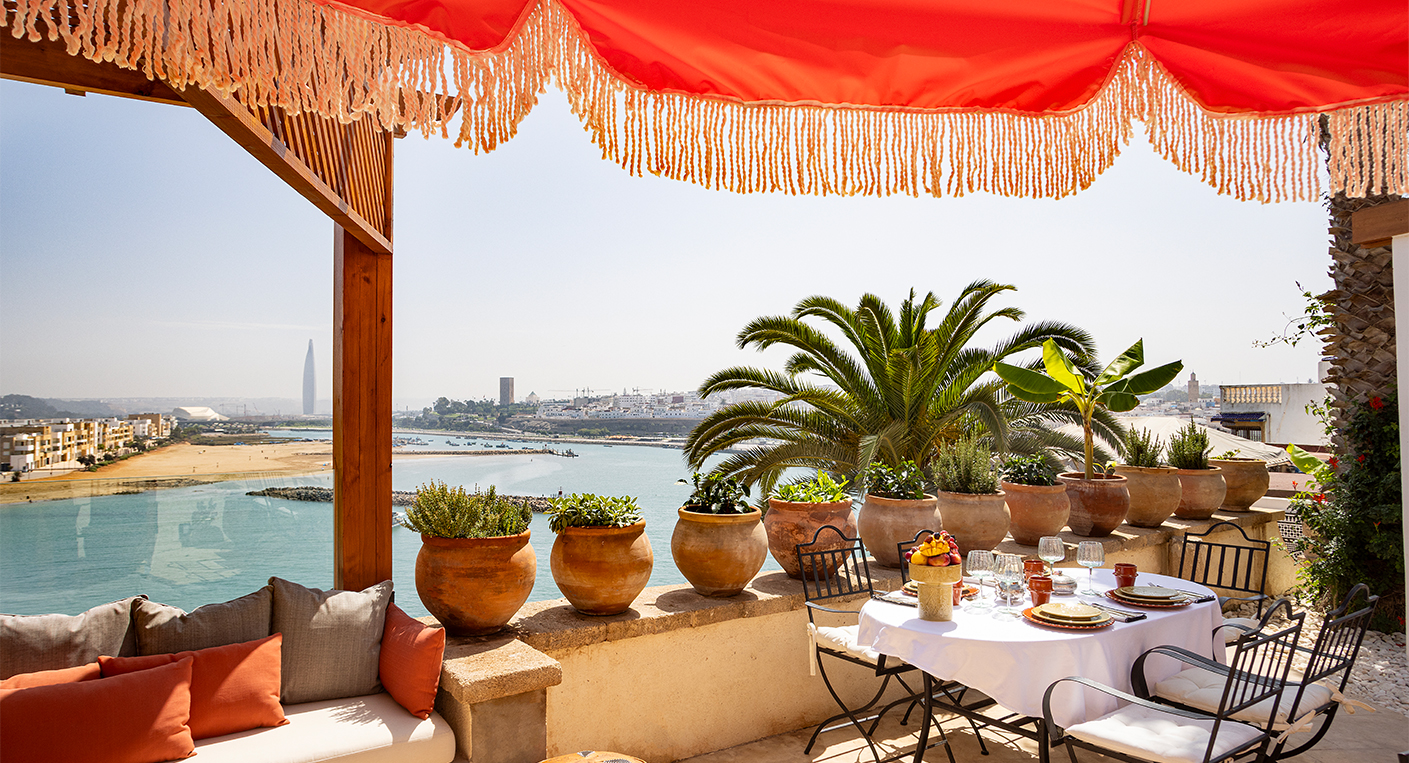 La terrasse de Dar Baraka déploie un panorama exceptionnel sur le Bouregreg, le théâtre de Rabat et la Tour Hassan.