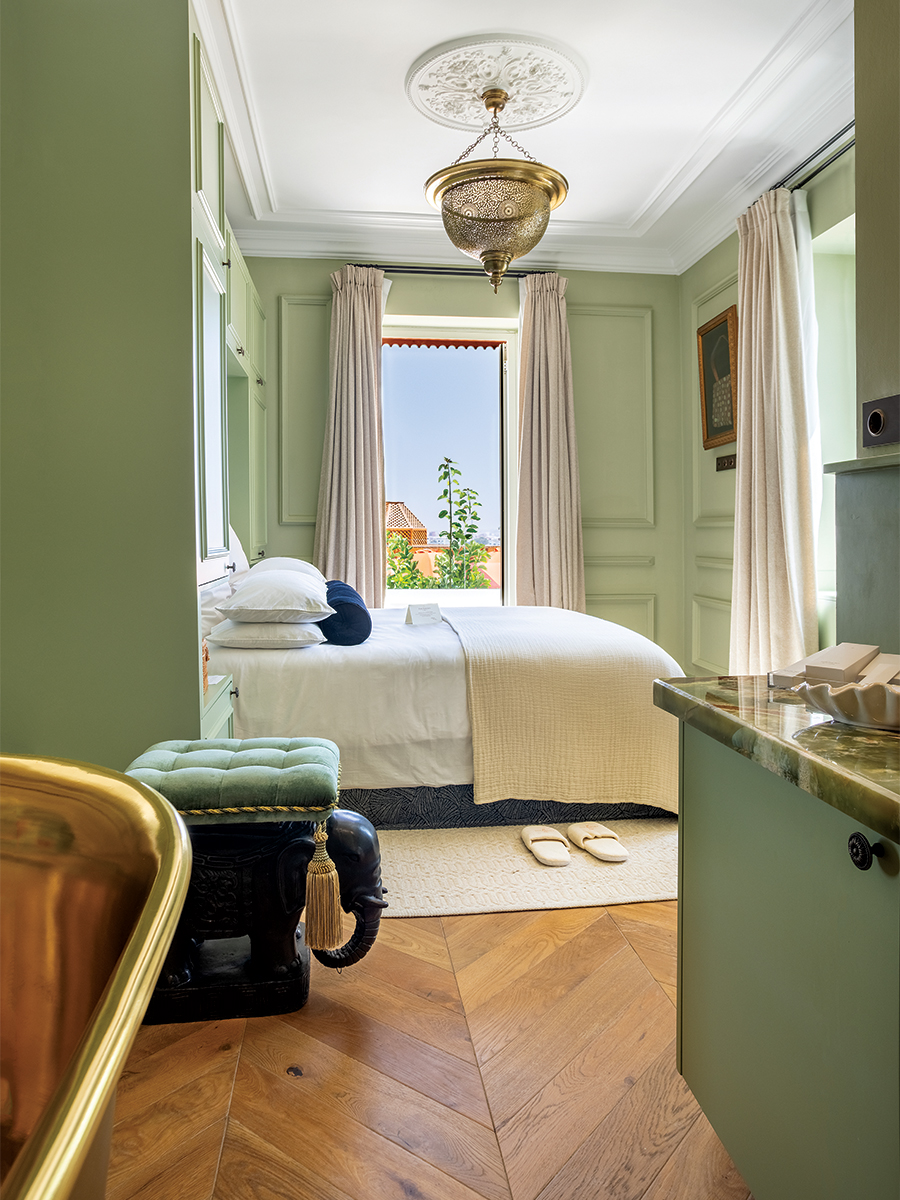 Dans la chambre à coucher, la baignoire sur mesure, ornée du blason familial d’Anissa, incarne sa philosophie « Bed With A View » et son approche sur mesure.