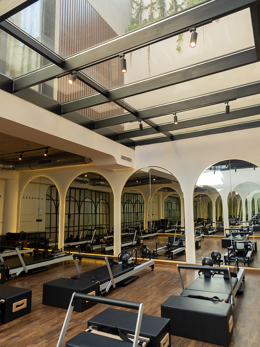 Une verrière zénithale prolonge cette quête de clarté dans la salle de Reformer, où le lierre grimpe le long des murs, brouillant la frontière entre intérieur et extérieur.