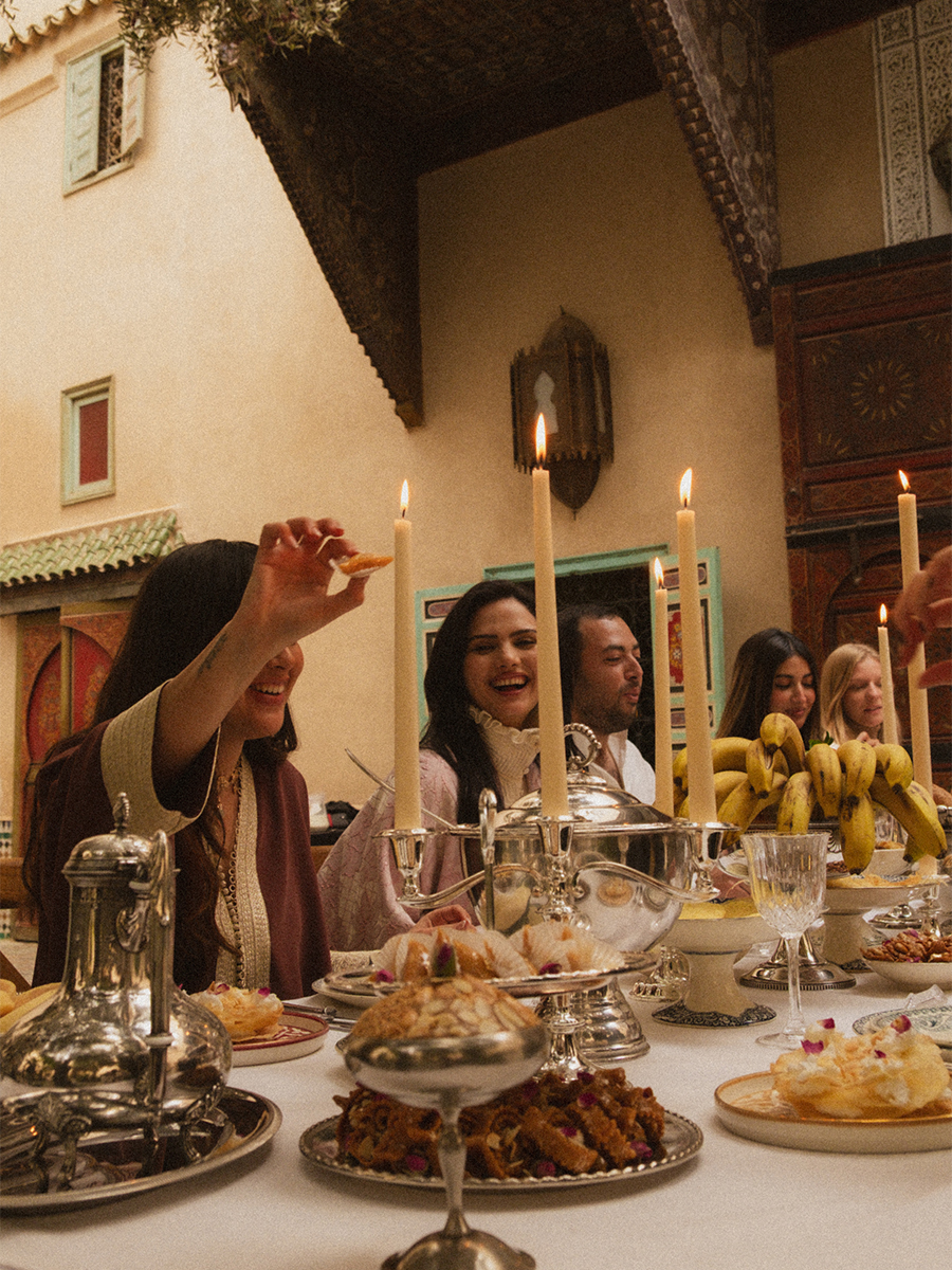 Puis le ftour lui-même, servi à une grande table collective où voyageurs et Marrakchis se retrouvent autour de classiques de la gastronomie marocaine, en plusieurs services. La soirée se prolonge ensuite autour du café Ben Ali, du thé et de jeux traditionnels, dans l’esprit des veillées d’antan.