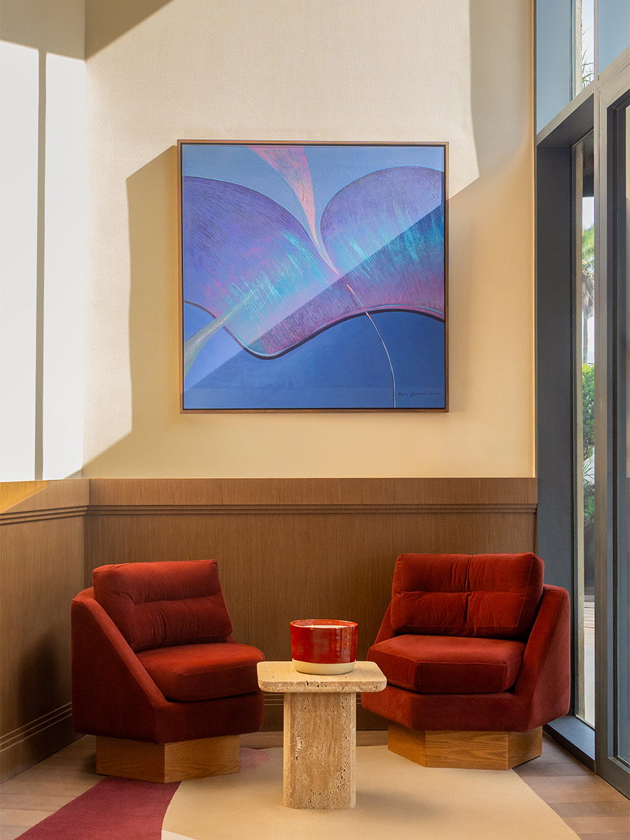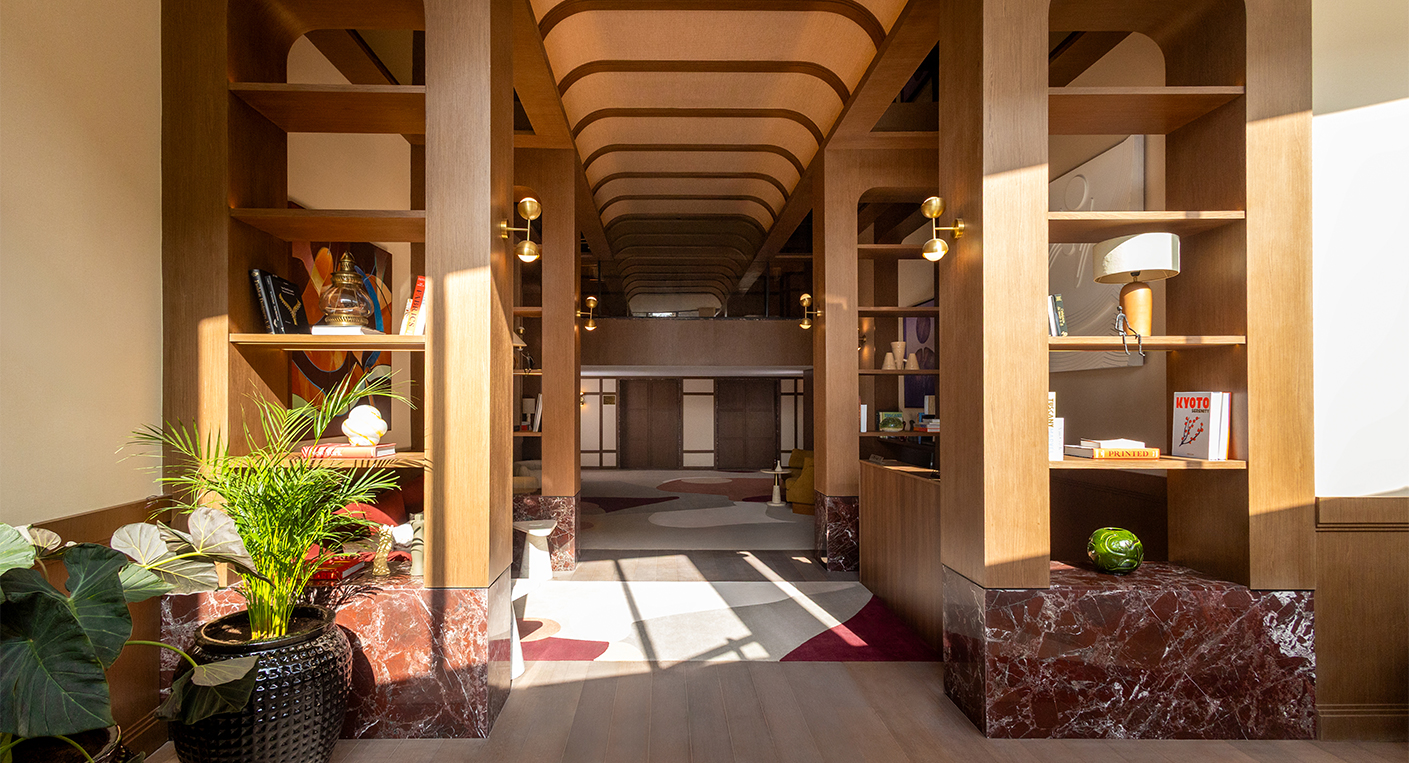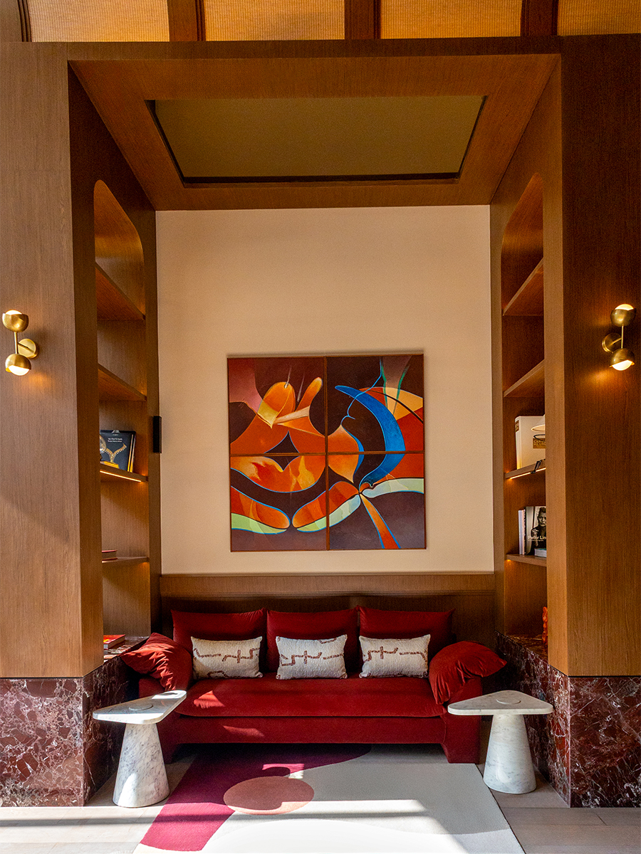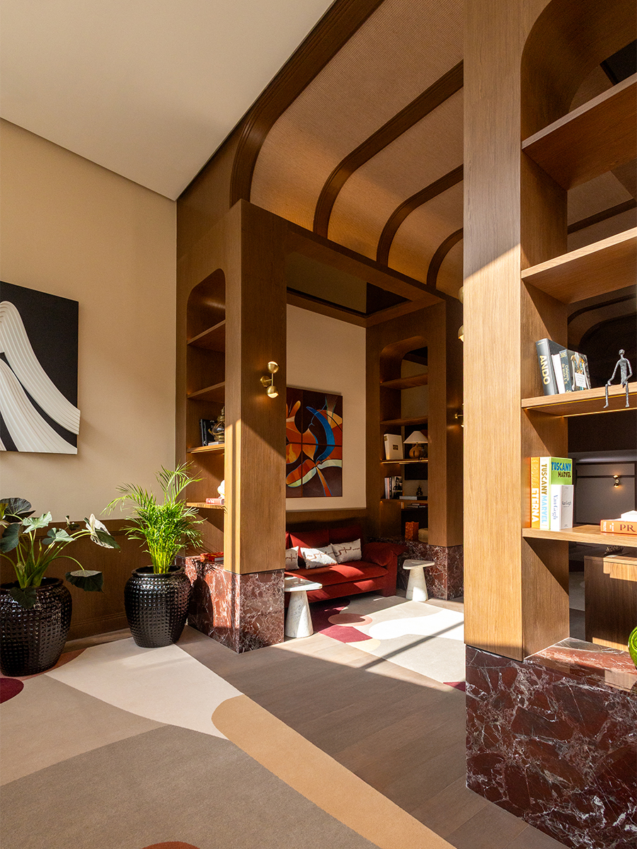 En nous guidant vers une bibliothèque, le designer poursuit : « Les matériaux donnent toute la personnalité au lobby. Le Rosso Levanto, avec ses nuances bordeaux profondes, apparaît en touches discrètes sur les socles, dans les bibliothèques ou encore dans les embrasures. Ce ton chaud dialogue naturellement avec le noyer, qui structure et habille les murs. Le laiton brossé, utilisé dans les appliques, apporte une note de contraste et de raffinement.«