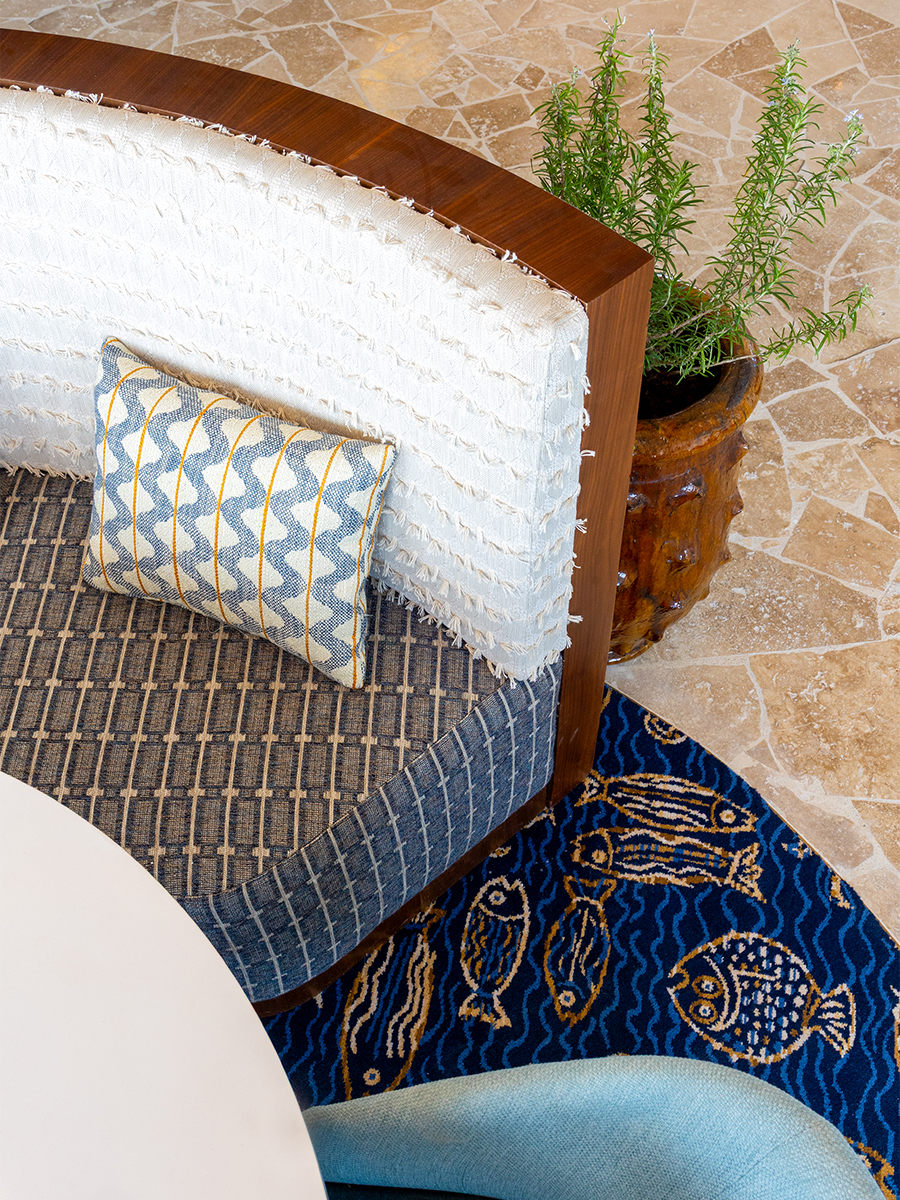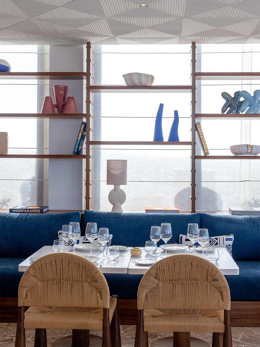 Christophe Pillet a dirigé l’architecture générale. Ali Lahlou (Casablanca) a été sollicité pour le lobby et Rubillini’s, tandis que Deer Home (Genève) a imaginé L’Aragosta, le restaurant du dernier étage. Beyt&Co a également collaboré pour produire des pièces de décoration sur-mesure pour le lobby et L’Aragosta. L’artiste Aurore de La Morinerie a créé des œuvres originales inspirées de la ville blanche à l’encre de Chine pour les chambres.
