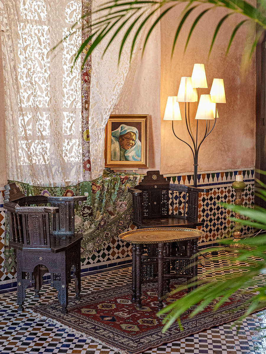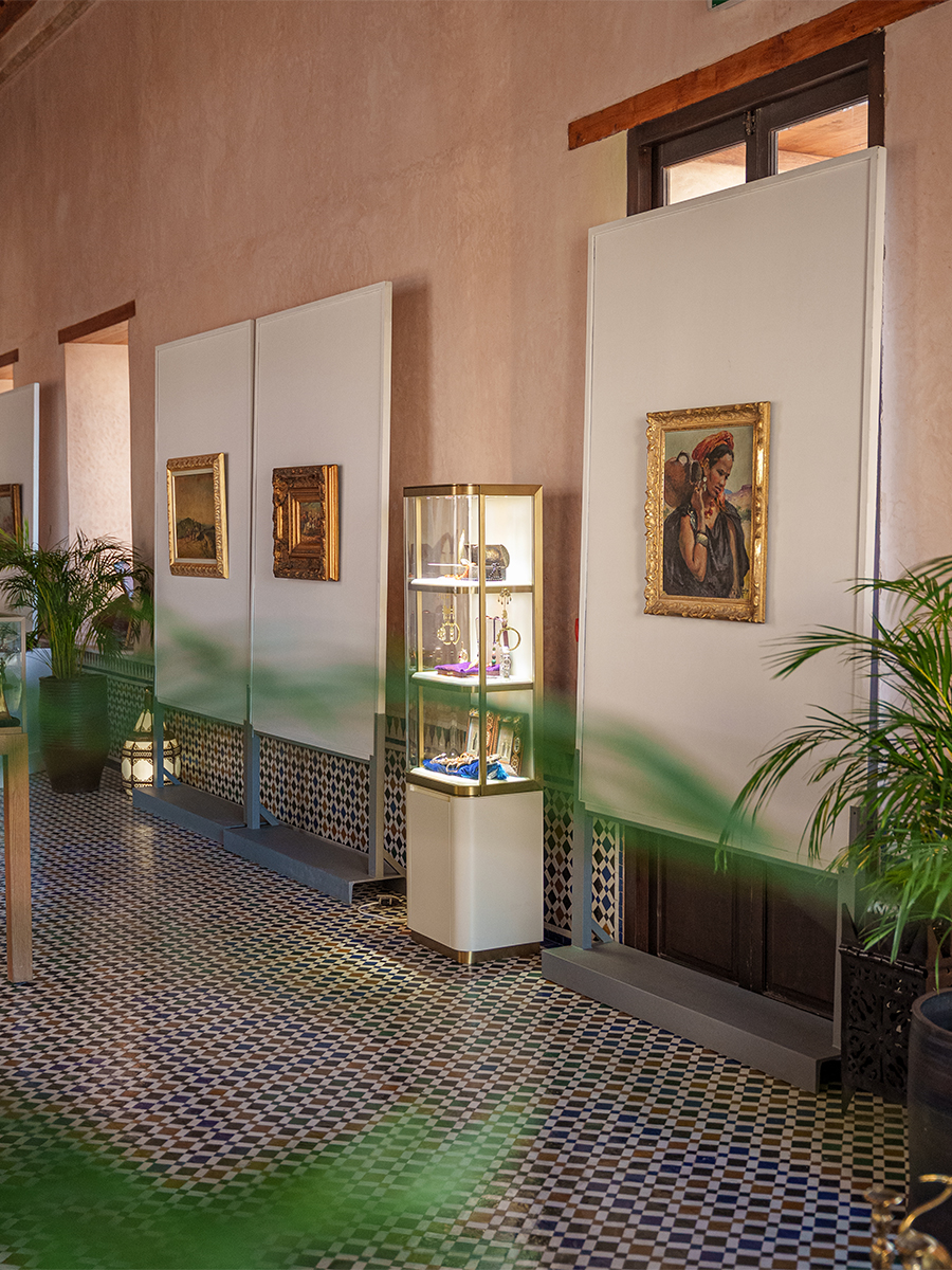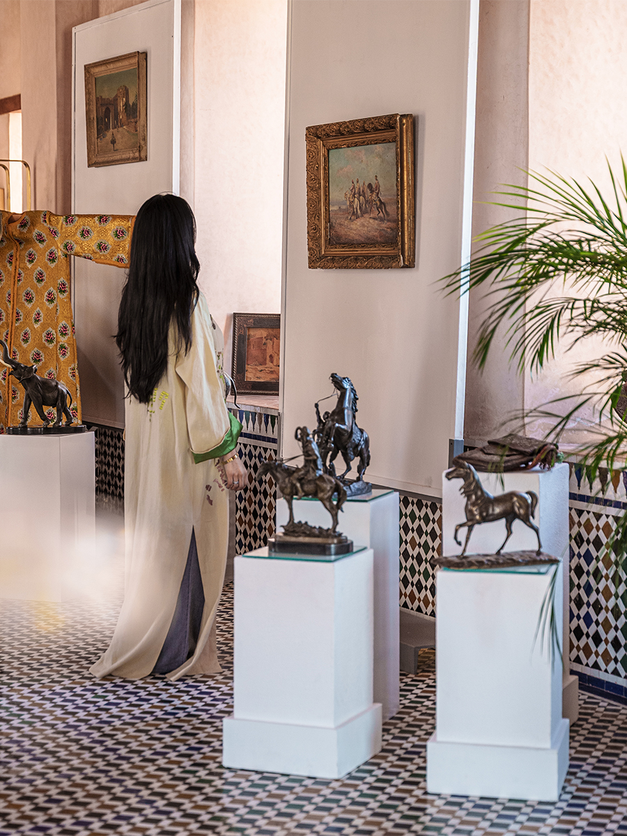 L’ambition est celle d’un cabinet de curiosités royal, où se côtoient des pièces issues d’un partenariat exclusif avec le Musée Belghazi, Dar Lqadi : caftans anciens et parures traditionnelles, manuscrits rares, Corans et textes de poésie soufie, peintures orientalistes, calligraphies contemporaines, céramiques fassies et instruments de musique d’une autre époque. Un ensemble qui dessine, par fragments, le portrait d’une civilisation dans toute son élégance.