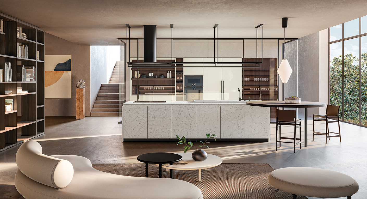 La sobriété des lignes combinée à l’élégance des matériaux convient aussi bien aux espaces ouverts qu’aux cuisines dédiées. Plan de travail surélevé, étagères linéaires épurées, bases sans poignées dont la partie supérieure saillante fait office de bouton, témoignent d’un parti pris résolument moderne.