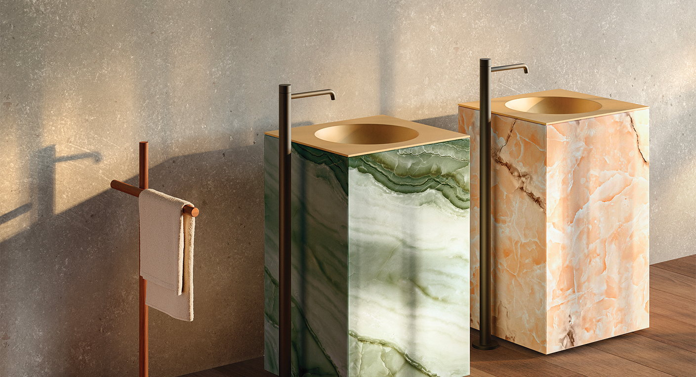 Monobloc, sa structure en aluminium recouverte de pierre naturelle est personnalisable avec un marbre noir, rose ou vert. Le plan et la vasque intégrés sont en laiton brossé. Dim. L. 55 x P. 50 x H. 87,2 cm. BOFFI.